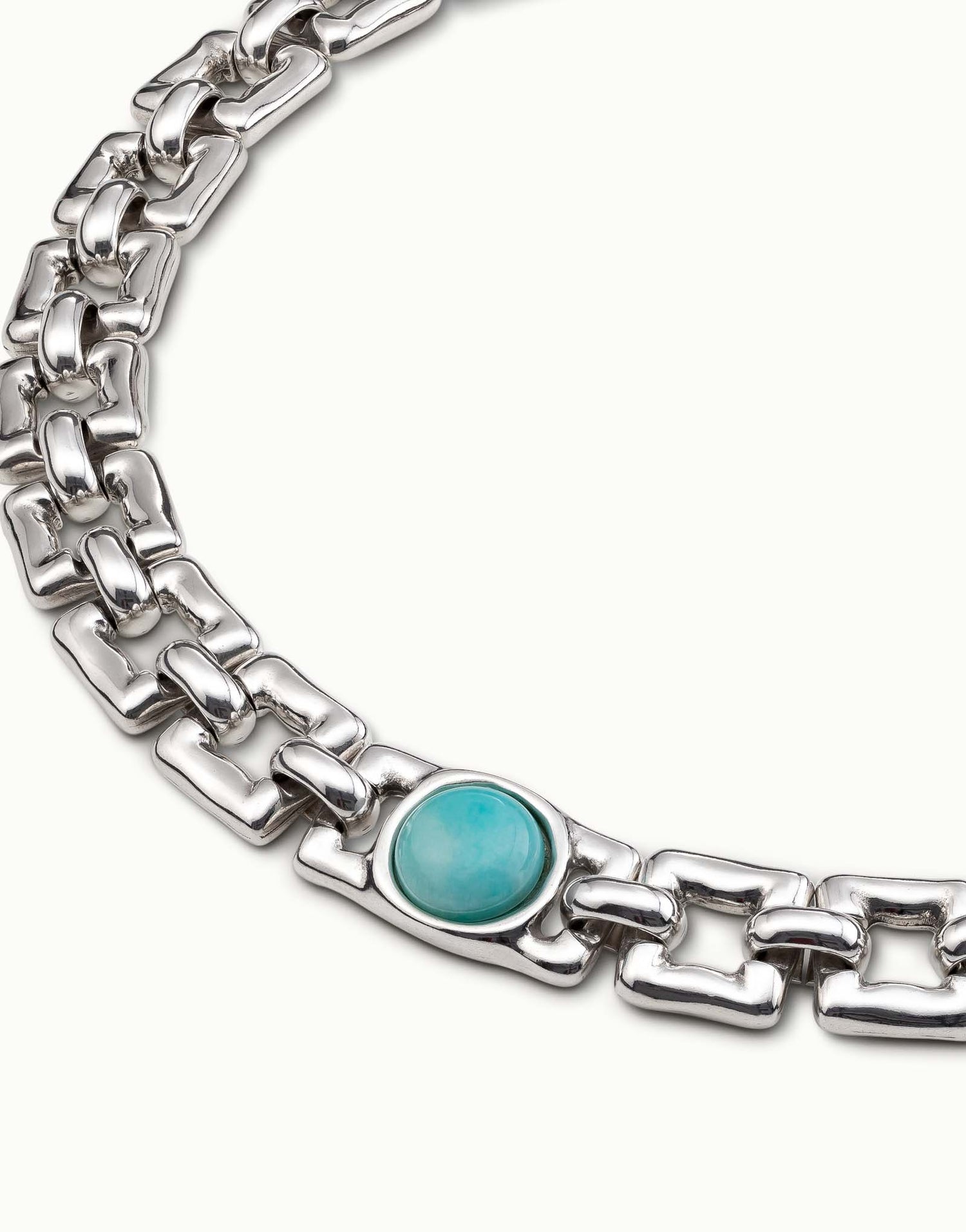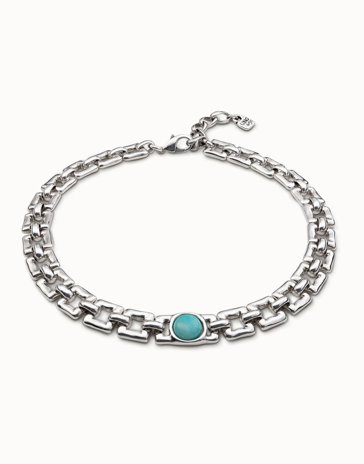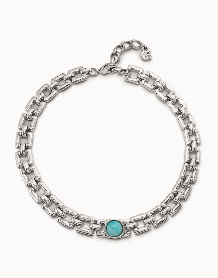 This handcrafted short necklace is made in Spain from a silver-plated metal alloy. It features small, squared links and a central natural stone pearl. It has an adjustable lobster clasp with a minimum length of 38 cm and a maximum length of 42 cm.
