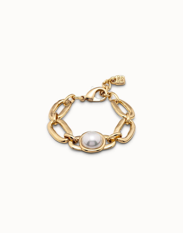 This Ovni bracelet by UNOde50 is a captivating piece that marries geometric precision with a touch of organic elegance. The unique oval-shaped links create a modern and structured chain, while the central pearl provides a soft, luminous contrast. This bracelet's design is both bold and sophisticated, making it a perfect statement piece. It symbolizes the harmonious blend of strength and softness, ideal for someone who loves to make a unique statement with their jewelry.