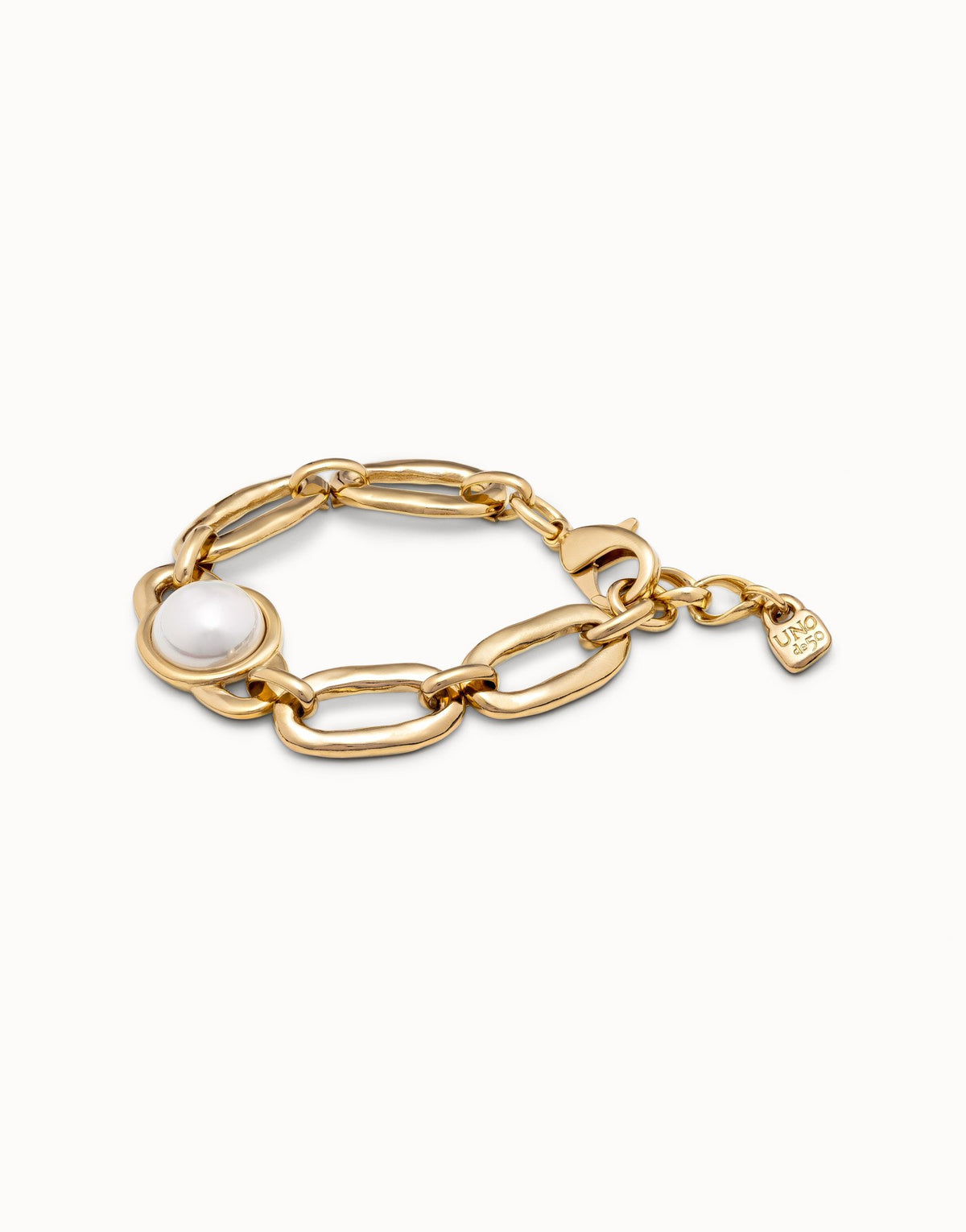 This handcrafted bracelet is made in Spain from an 18k gold-plated metal alloy and features oval-shaped links with a central shell pearl. This is the Medium size, with a minimum perimeter of 15.7 cm and a maximum perimeter of 17.5 cm. It also includes an extender for a maximum perimeter of 20.5 cm.