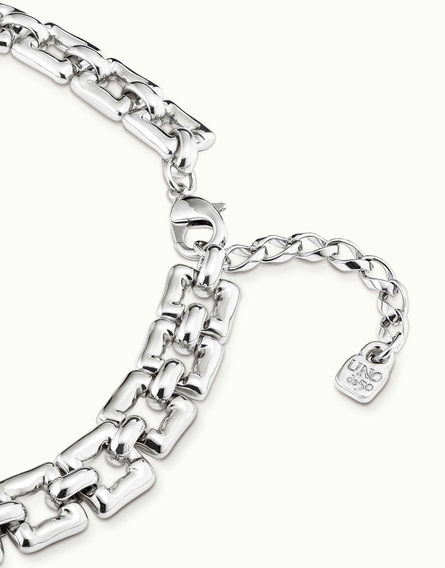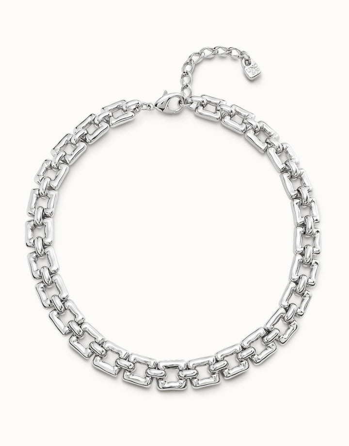 This short necklace by UNOde50 is a modern and minimalist staple. The design features a continuous chain of small, square links that create a clean, architectural look. This piece is a testament to understated elegance and can be effortlessly styled with any outfit. It's a versatile accessory that is perfect for layering or wearing alone for a subtle, sophisticated statement. The handcrafted quality adds a luxurious feel, making it a timeless addition to any collection.