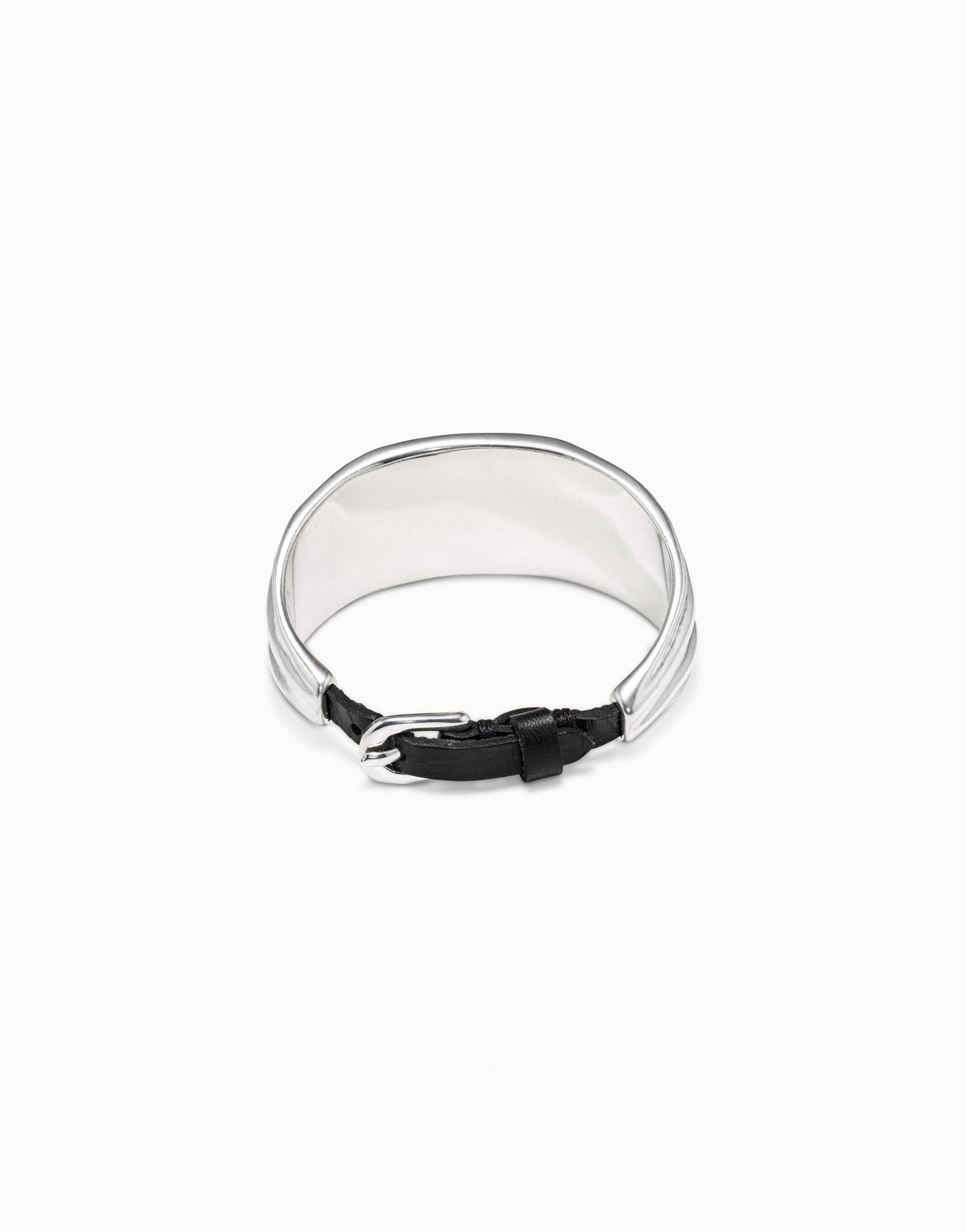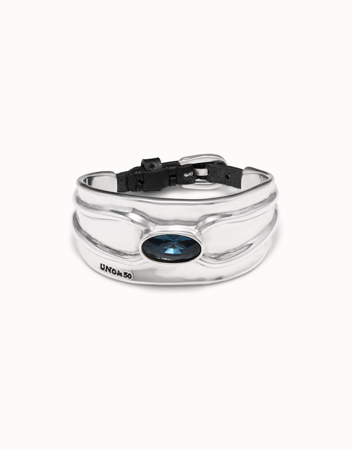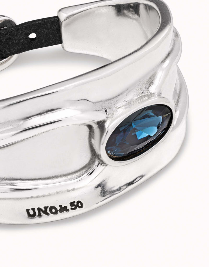 This Guardian bracelet by UNOde50 is a bold and powerful statement piece with a rich, textural design. The embossed cuff features a central blue crystal, creating a striking focal point that contrasts beautifully with the industrial-chic metal. The unique leather buckle clasp adds a rugged yet sophisticated touch. This bracelet symbolizes strength and individuality, and it's an ideal accessory for someone who wants to add an edgy, luxurious element to their look.