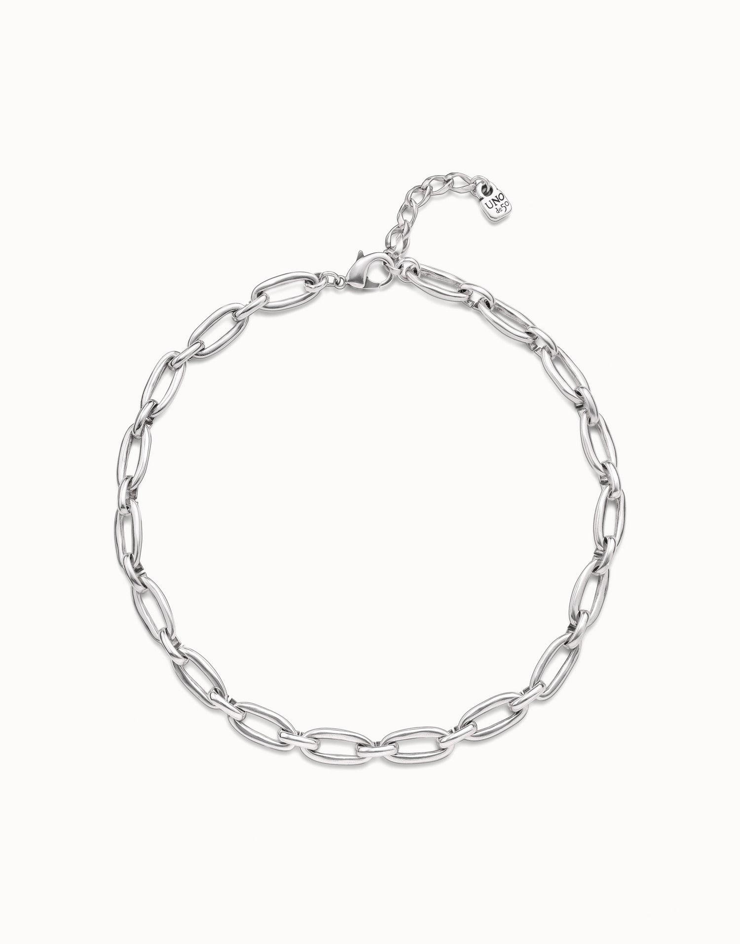 This handcrafted short necklace is made in Spain from sterling silver-plated metal. It features mid-sized oval links and a carabiner clasp, with a minimum length of 44 cm and a maximum length of 48.5 cm.