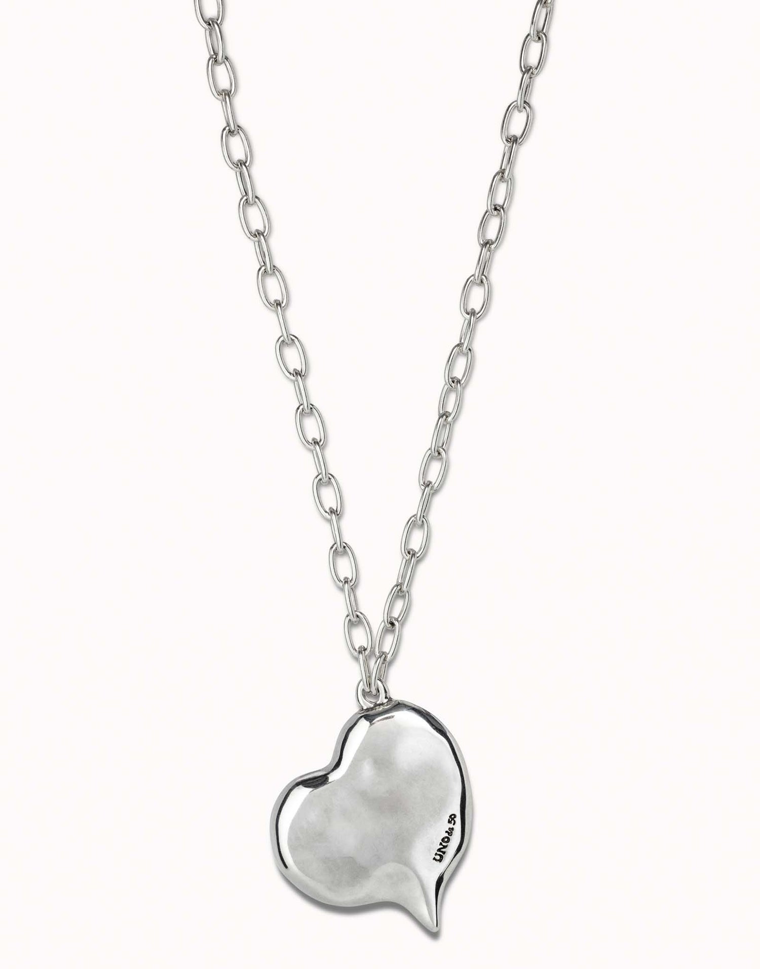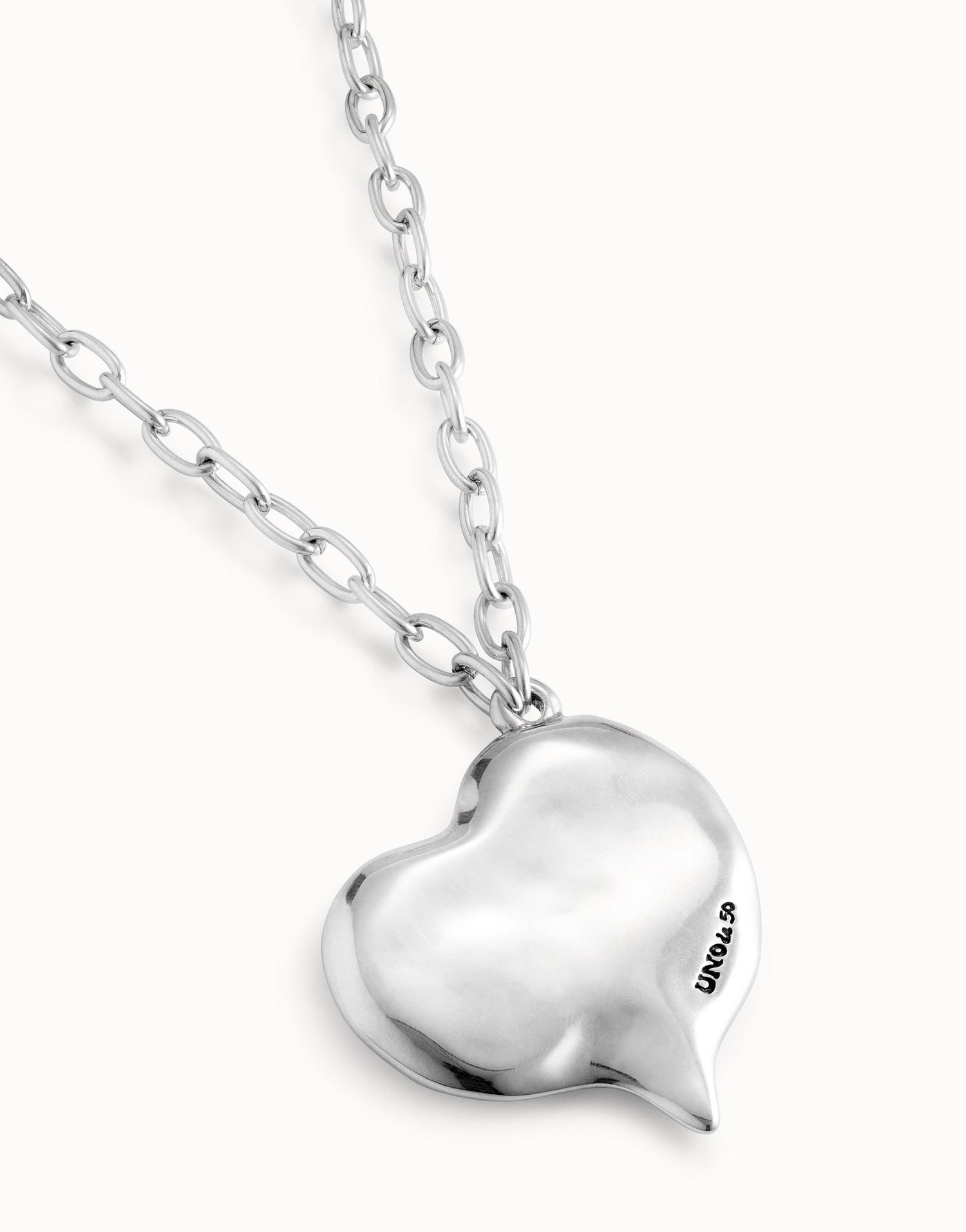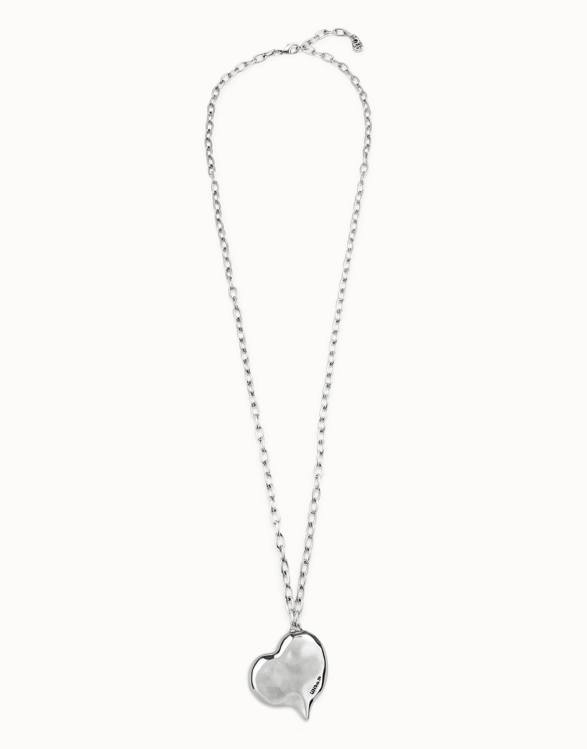 This handcrafted long necklace is an iconic UNOde50 piece, made in Spain from a unique silver-plated metal alloy. It features a large heart pendant with a bead size of 6 cm. It has an adjustable lobster clasp with a minimum length of 94.5 cm and a maximum length of 99 cm. The necklace weighs 104.4 g.