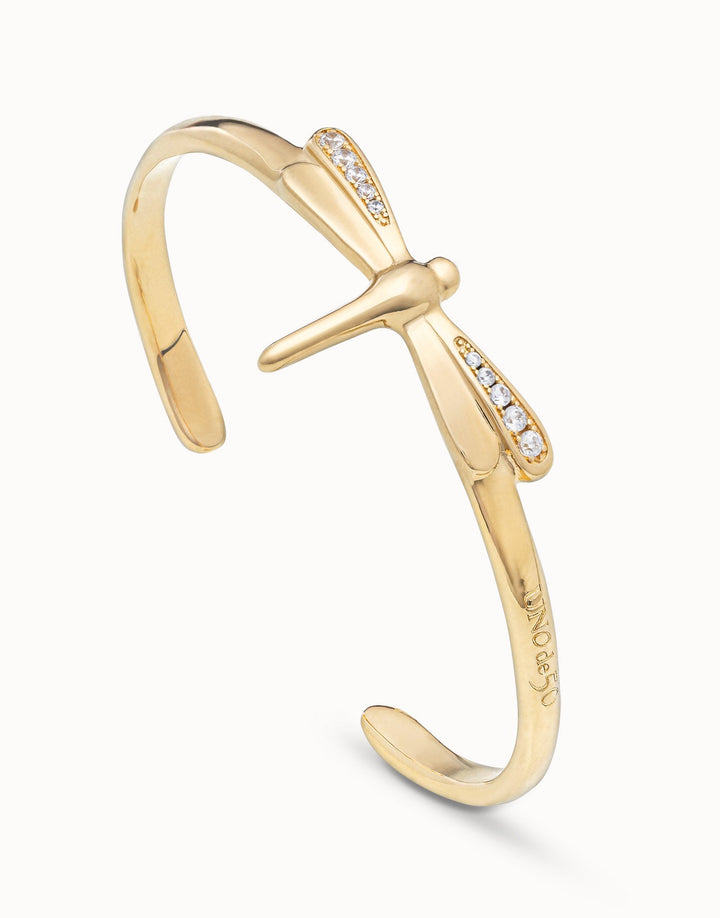 This Dragonfly cuff bracelet by UNOde50 captures a whimsical and enchanting vibe, inspired by the delicate beauty of nature. The open design wraps gracefully around the wrist, culminating in a central dragonfly adorned with a vibrant topaz crystal. This piece feels light and airy, symbolizing transformation, change, and adaptability. It's an ideal accessory for someone with a free spirit, perfect for adding a touch of bohemian elegance and personal meaning to a daytime outfit.
