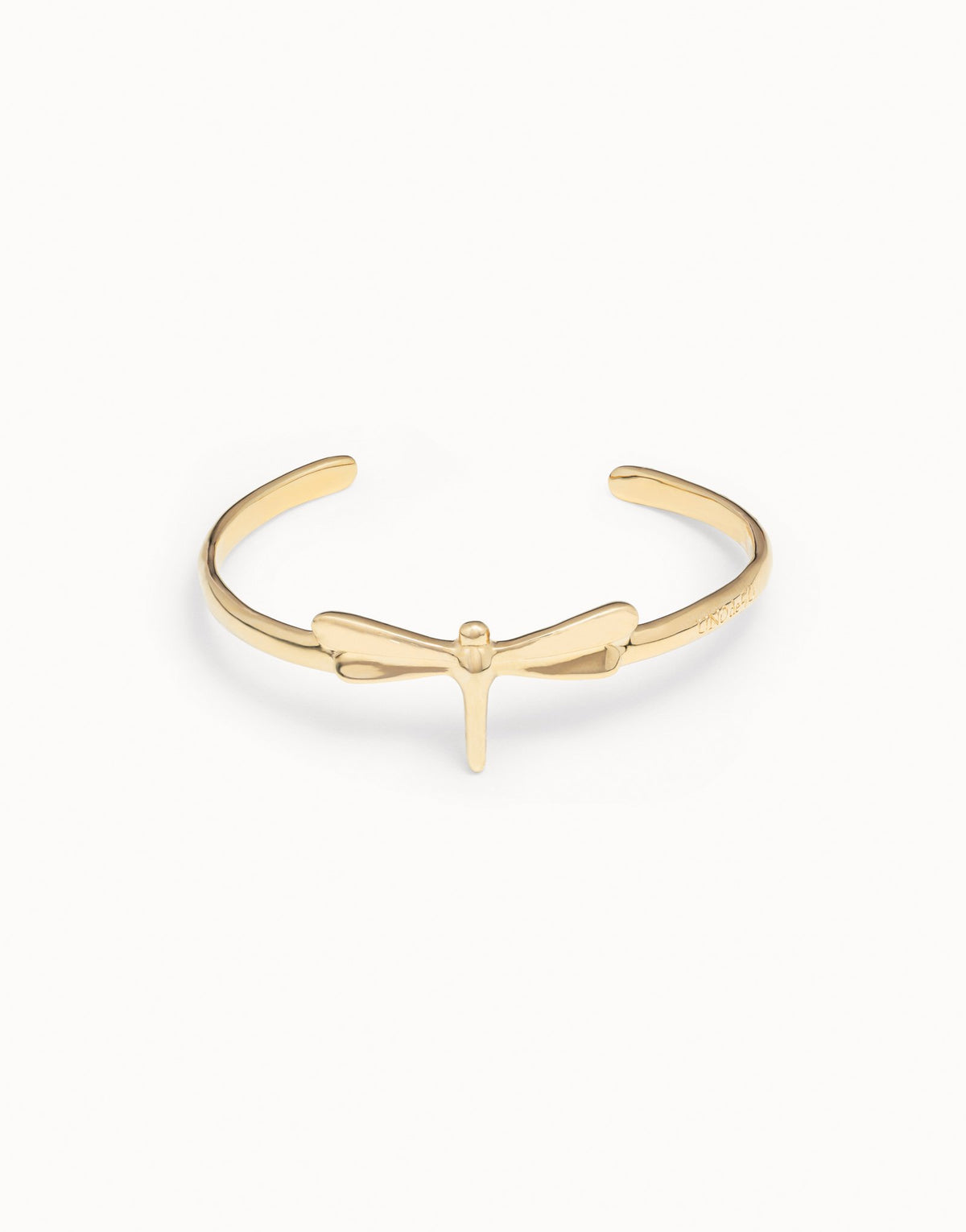 This handcrafted bracelet is made in Spain from a unique golden-plated brass. It has an open design with a central dragonfly and a minimum perimeter of 15.7 cm.