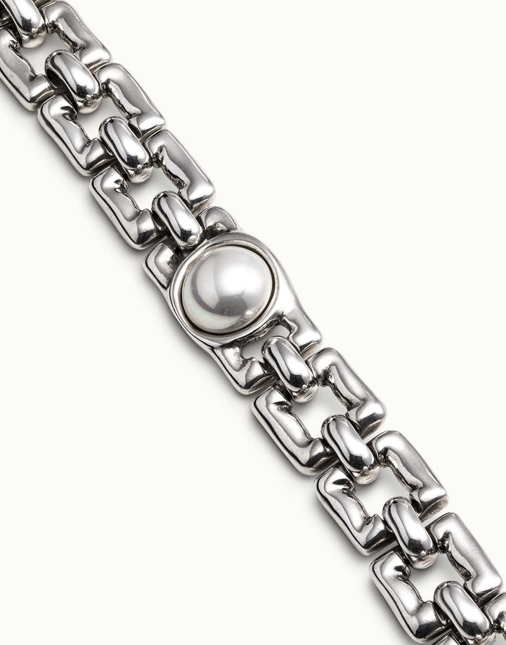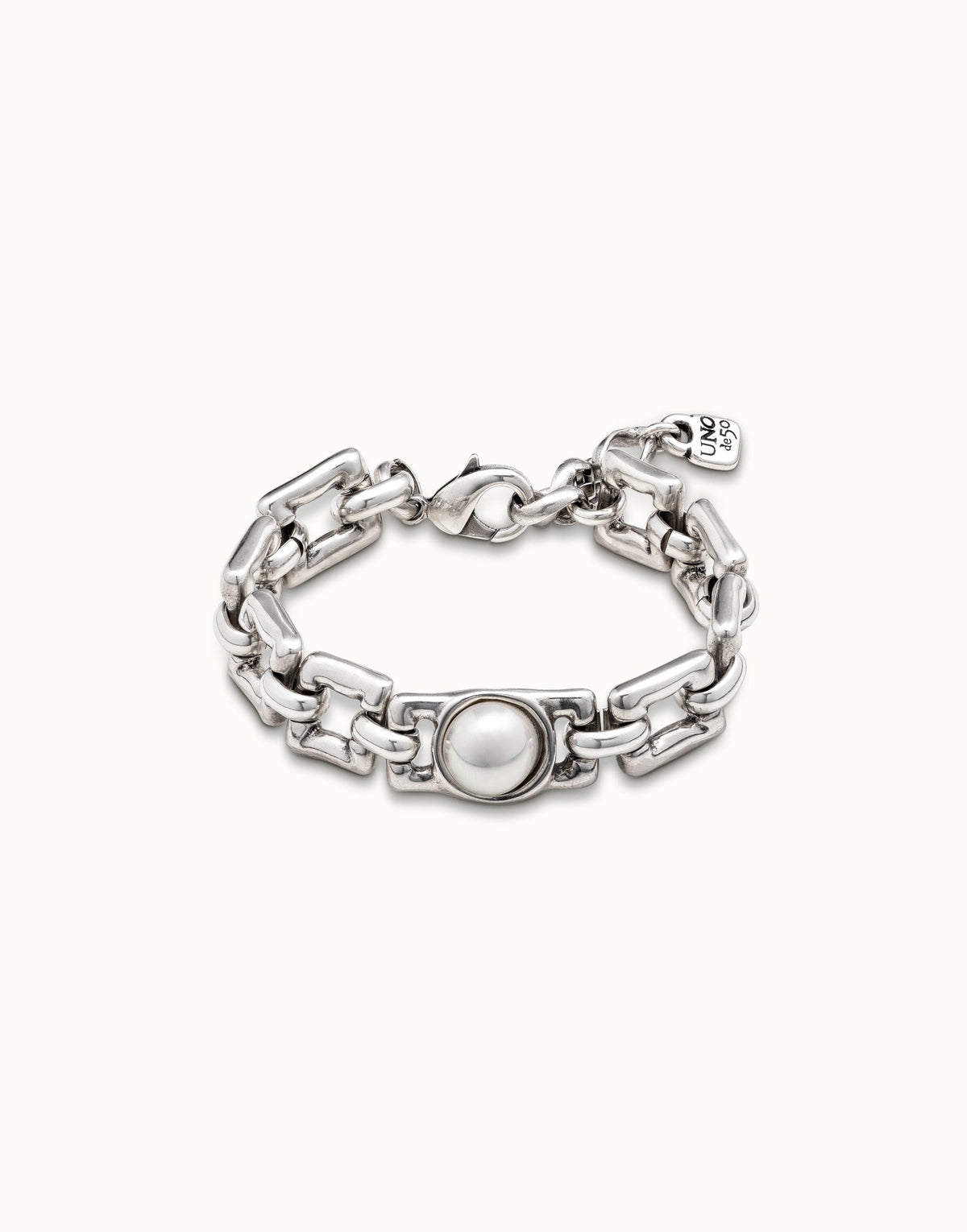 This handcrafted bracelet is made in Spain from a silver-plated metal alloy with small, squared links and a central shell pearl. This is the Small size, with a minimum perimeter of 15.7 cm, a maximum perimeter of 17.5 cm, and a maximum perimeter with the extender of 20.5 cm.