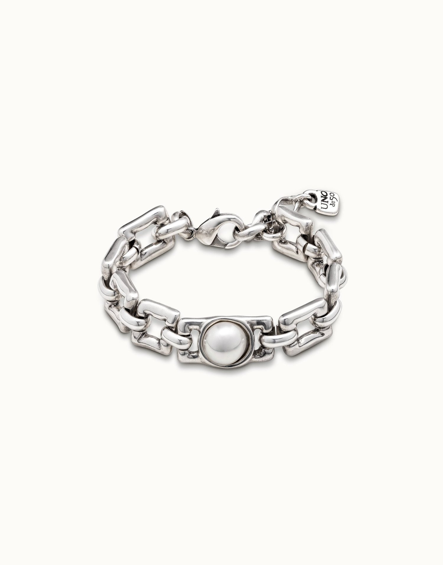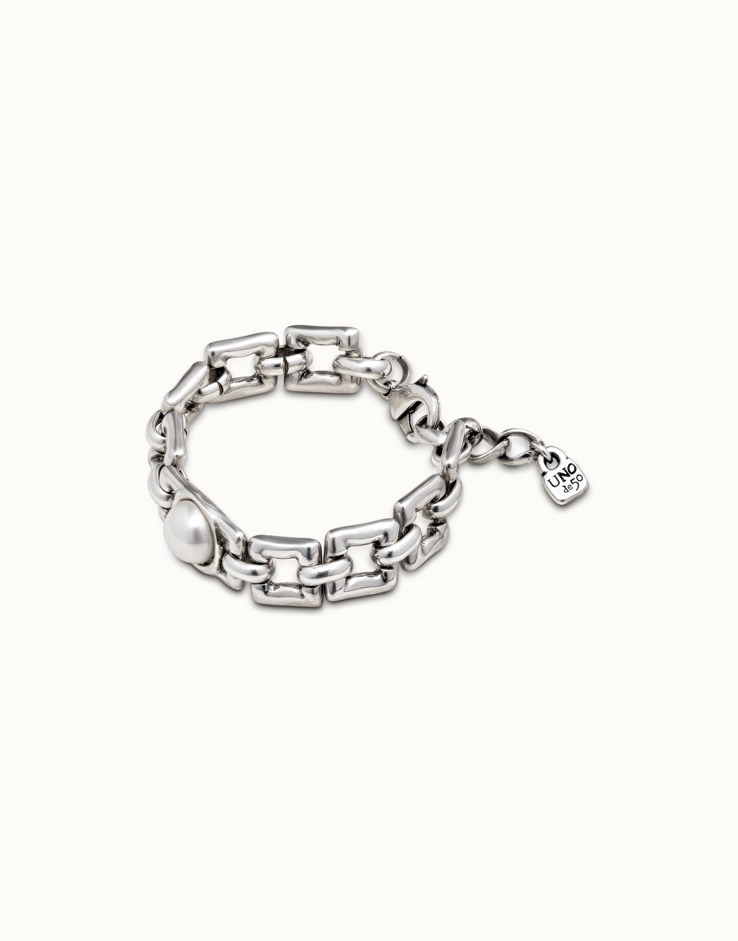 This Linda bracelet by UNOde50 is a charming and delicate piece that balances modern design with classic beauty. The small, squared links create a subtle, contemporary chain, while the central pearl adds a touch of soft, timeless elegance. This bracelet is a beautiful symbol of balance and grace, perfect for the person who appreciates refined, understated style. It’s a versatile piece that can be worn daily as a personal treasure or for a special occasion, adding a luminous focal point to any look.
