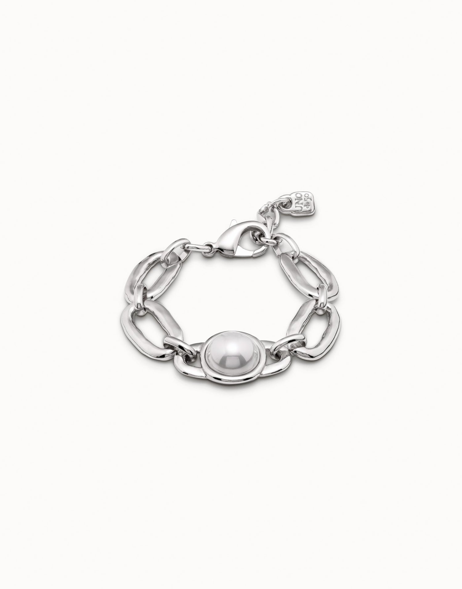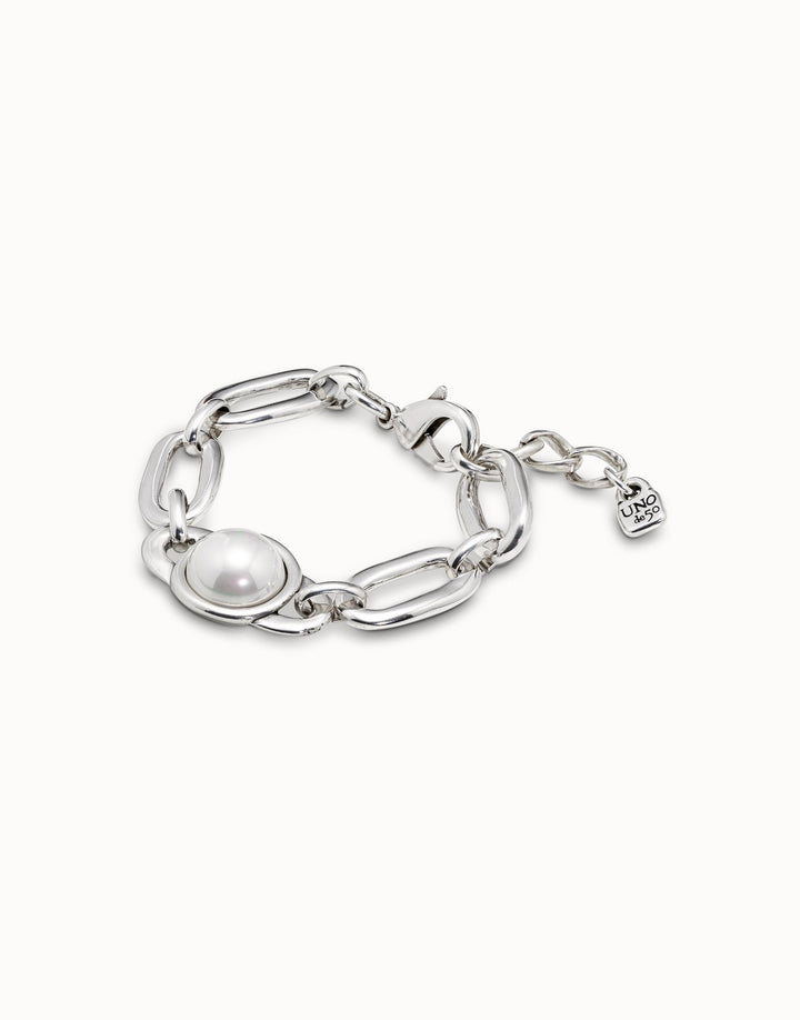 This Ovni bracelet by UNOde50 is a captivating piece that marries geometric precision with a touch of organic elegance. The unique oval-shaped links create a modern and structured chain, while the central pearl provides a soft, luminous contrast. The bracelet's design is both bold and sophisticated, making it a perfect statement piece. It symbolizes the harmonious blend of strength and softness, ideal for someone who loves to make a unique statement with their jewelry.