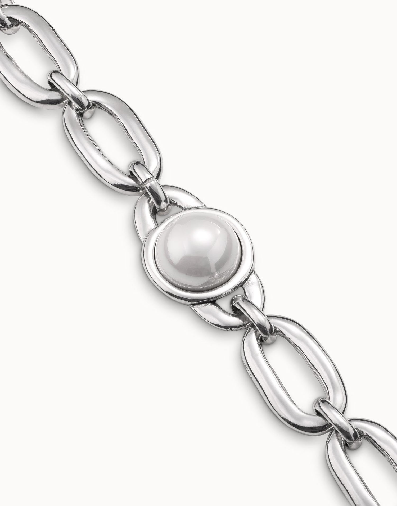 This handcrafted bracelet is made in Spain from a silver-plated metal alloy and features oval-shaped links with a central shell pearl. This is the Long size, with a minimum perimeter of 15.7 cm, a maximum perimeter of 17.5 cm, and a maximum perimeter with the extender of 20.5 cm.