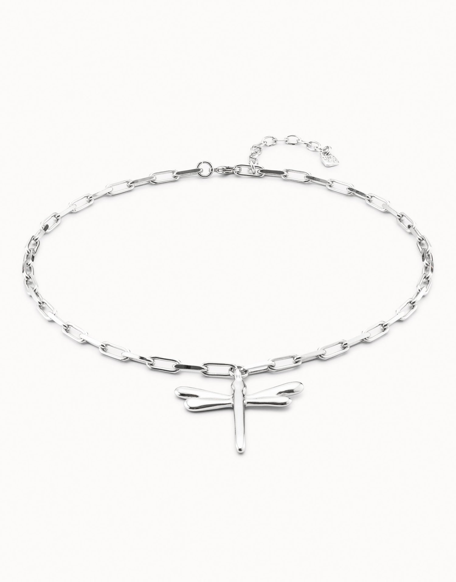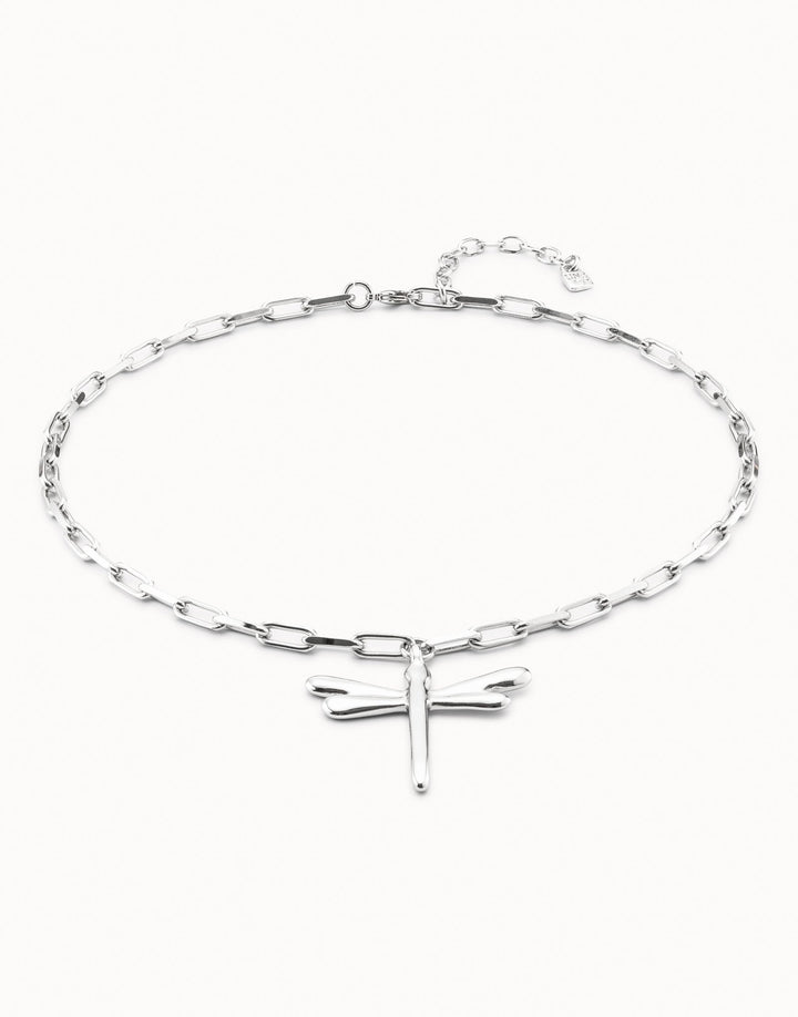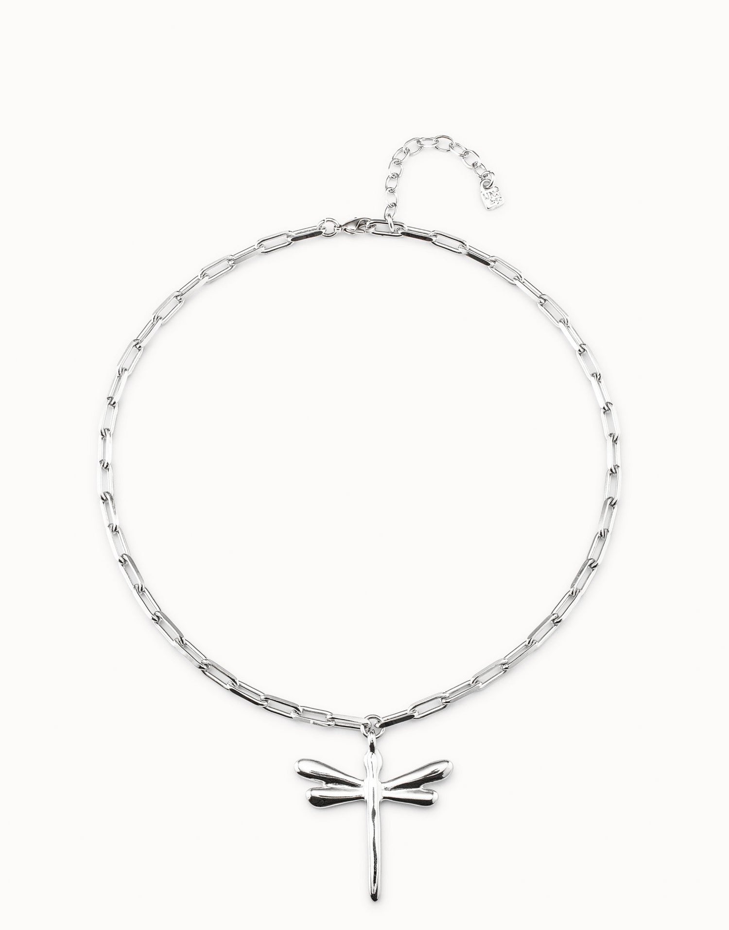 This handcrafted necklace is made in Spain from a silver-plated metal alloy. This is a short necklace with a minimum length of 42.5 cm and a maximum length of 48 cm. It features a medium dragonfly pendant with a bead size of 4.2 cm.