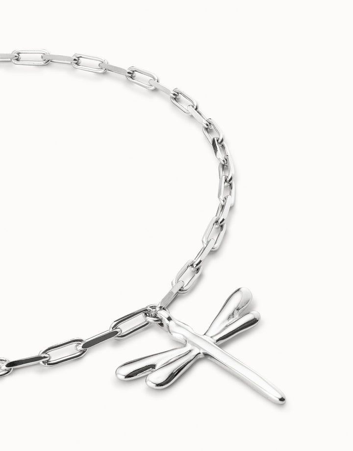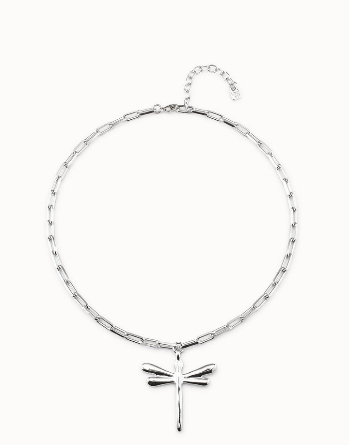 This FREEDOM necklace by UNOde50 is an ode to a free-spirited, modern aesthetic. The fine chain of small links provides a delicate foundation, while the central dragonfly pendant adds a touch of whimsical elegance and symbolic meaning. The dragonfly is a powerful symbol of change, transformation, and adaptability. This necklace is an ideal accessory for someone who embraces their adventurous side, perfect for pairing with a casual street-style look or for adding a touch of natural beauty to a layered necklace ensemble.