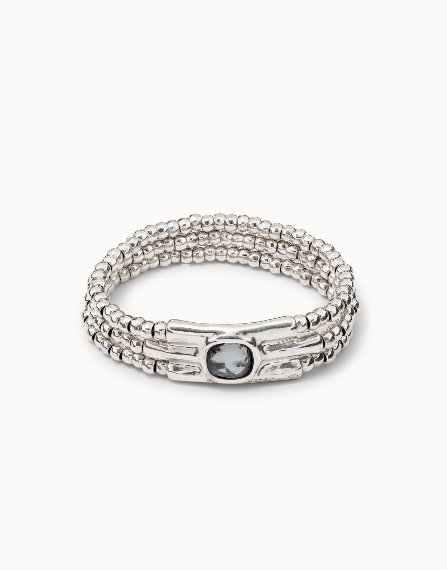 This Infinite bracelet from the Fearless collection by UNOde50 is a bold and captivating piece with a modern, layered design. The three beaded tiers create a sense of texture and depth, while the central cast tubes and a gray crystal provide a focal point of structured elegance. This bracelet symbolizes strength and a fearless spirit, making it an excellent accessory for the person who loves to make a statement with their jewelry. Its design feels both robust and refined, perfect for adding a touch of sophisticated edge to any look.
