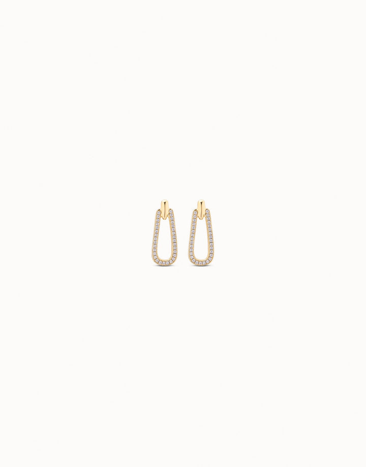 These drop earrings by UNOde50 are a perfect blend of modern design and classic sparkle. The beautiful link-shaped form is enhanced by a brilliant white topaz, providing a subtle yet captivating glow. These earrings are for the person who appreciates a luxurious and timeless aesthetic, with a design that feels both bold and elegant. They are a versatile accessory, perfect for adding a touch of sophistication to a professional outfit or a hint of glamour to an evening look.