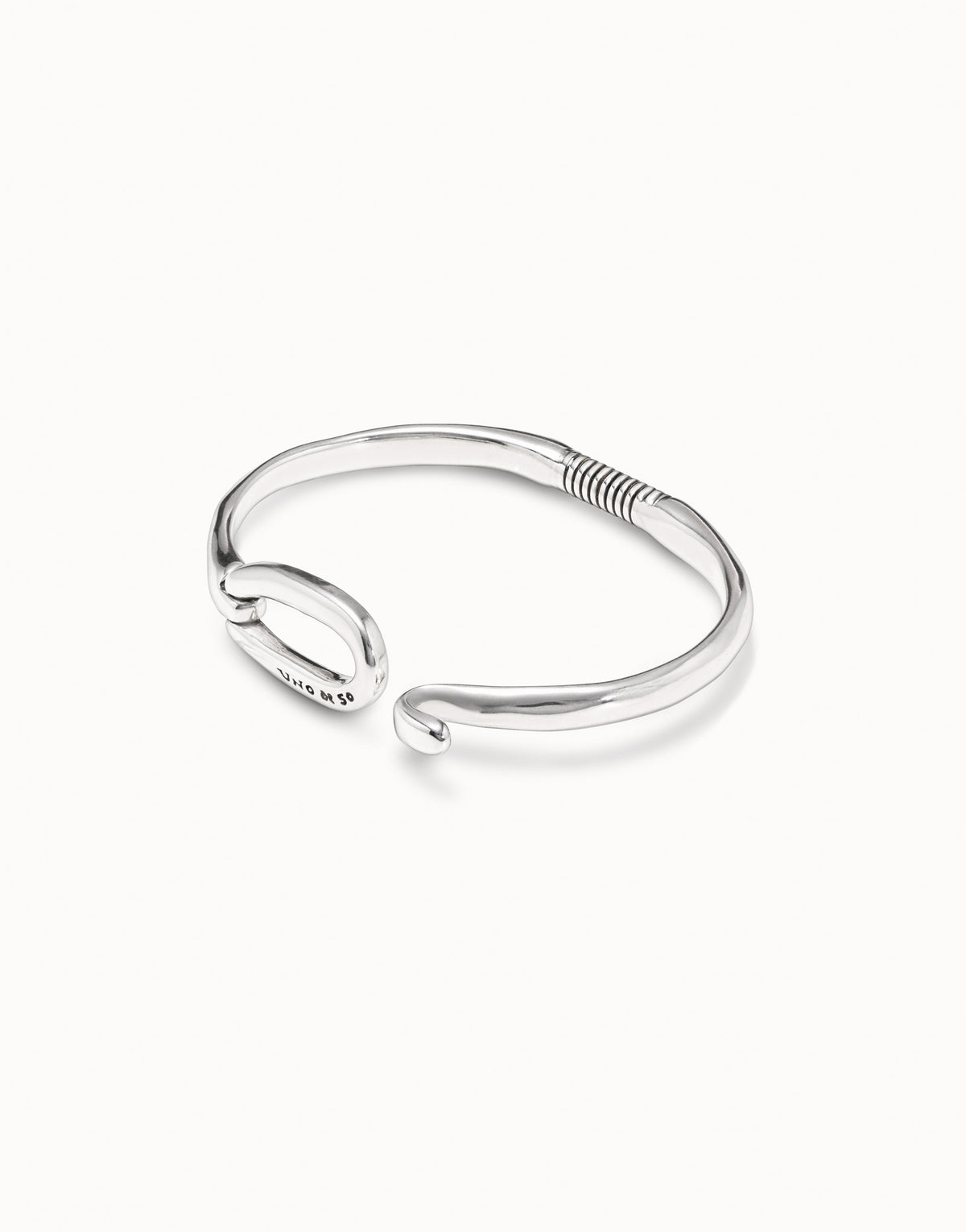 This handcrafted bracelet is made in Spain from a silver-plated cast metal alloy. It has a hidden spring and a hook clasp, with a minimum perimeter of 16 cm.