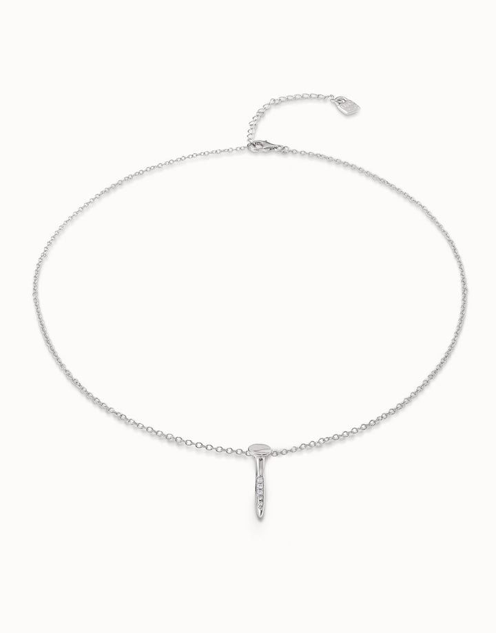 This necklace by UNOde50 is a unique and edgy piece that blends industrial design with luxurious detail. The sterling silver-plated chain holds an iconic nail pendant, a symbol of strength and individuality, which is beautifully accented with a sparkling topaz stone. This necklace is for the person who wants to make a bold, personal statement. It's a versatile and powerful accessory that adds a touch of rebellion and sophistication to any everyday look.