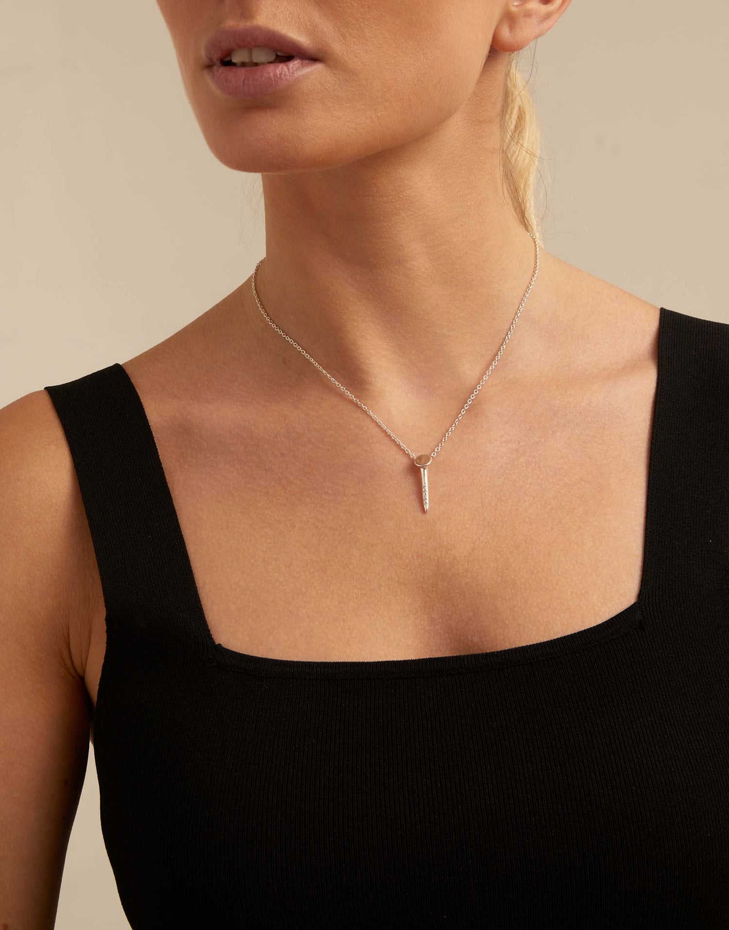 This handcrafted necklace is made in Spain from a silver-plated metal alloy. It is a short necklace with a minimum length of 38 cm and a maximum length of 42.5 cm. It features an iconic nail pendant with a bead size of 2 cm and a topaz stone.
