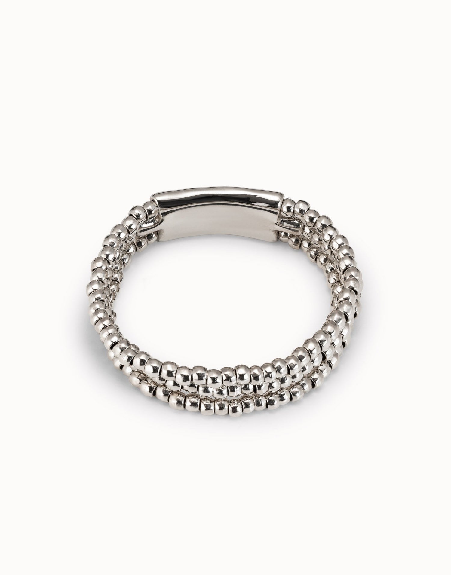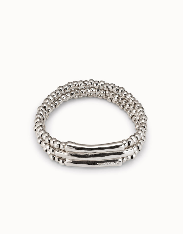 This handcrafted bracelet is made in Spain from a silver-plated metal alloy. It features three beaded strands with a central piece of small cast tubes. This is the XS size with a minimum perimeter of 16.6 cm.