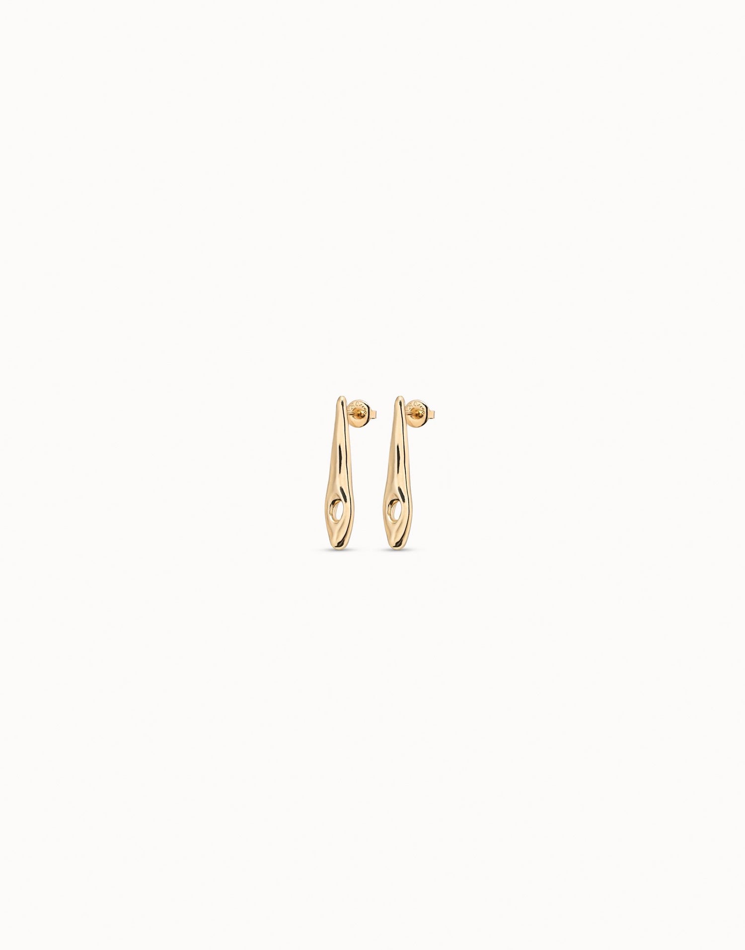 This pair of handcrafted earrings is made in Spain from an 18k gold-plated metal alloy. They are a stud style in the shape of a dragonfly wing with a minimum length of 3.3 cm.