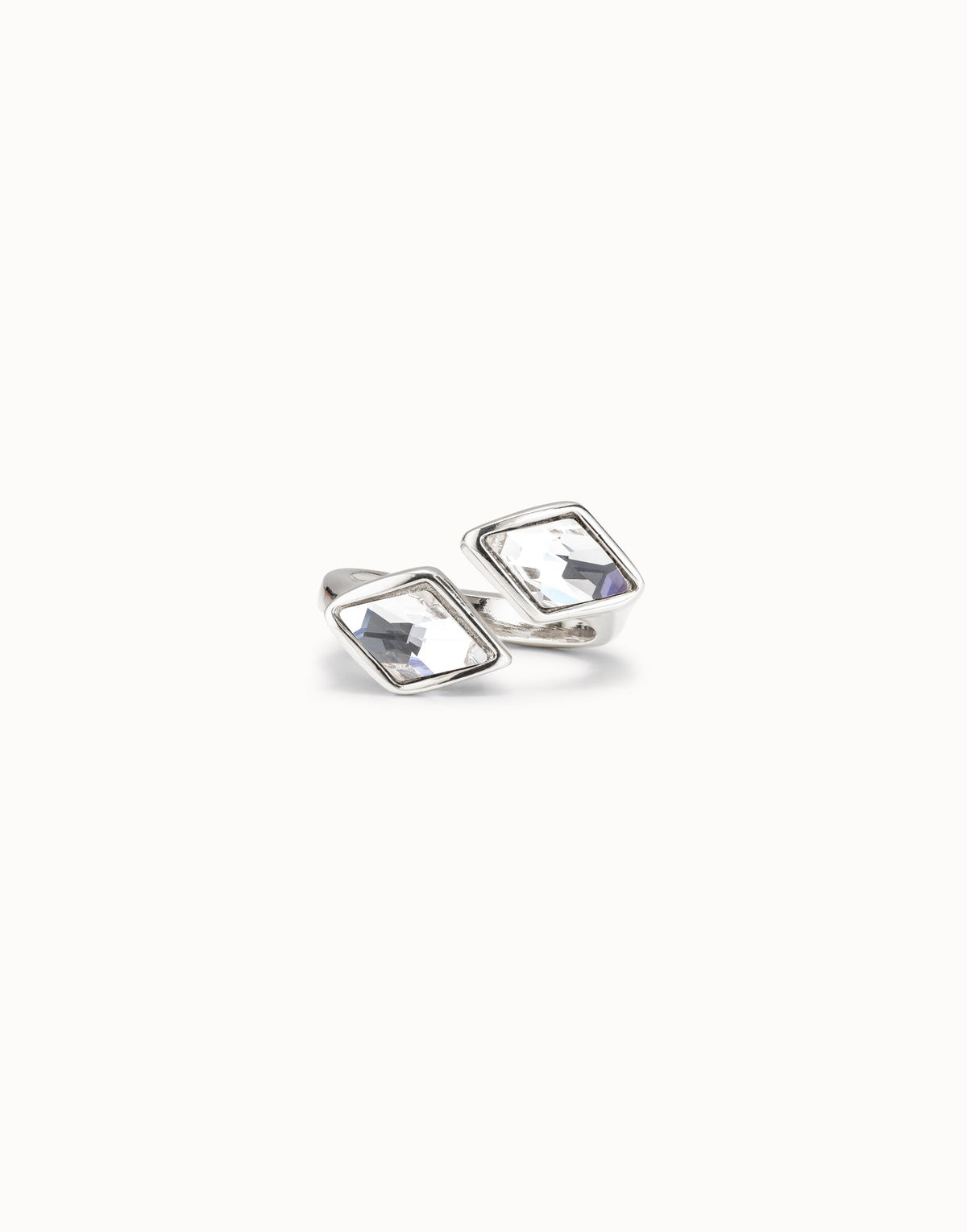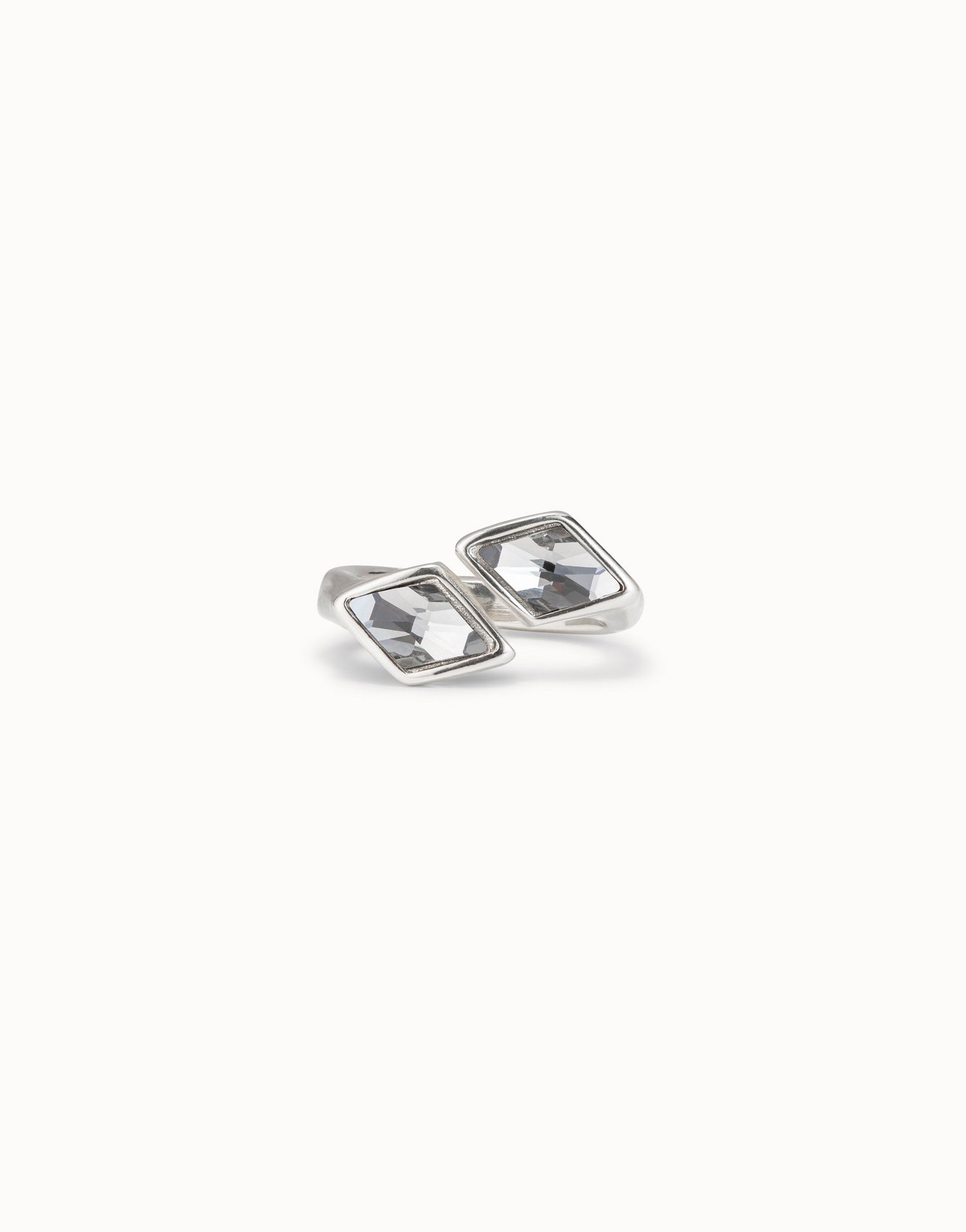 This handcrafted ring is made in Spain from a silver-plated metal alloy. It has an open design with two rhomboid shapes at the ends, each with a gray faceted crystal. This is a size 52 with a diameter of 16.5 mm.