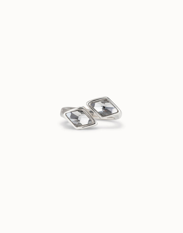 This open ring by UNOde50 is a unique and artistic piece that embodies the essence of Dazzle art. The open design features two rhomboid shapes at the ends, each adorned with a beautiful gray faceted crystal. This ring is for the person who appreciates a blend of geometric precision and modern elegance. It's a statement of skill and beauty, perfect for adding a touch of sophisticated drama and artistic flair to any outfit.