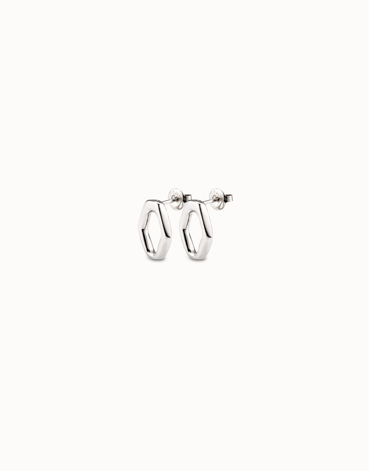 This pair of handcrafted earrings is made in Spain from a silver-plated metal alloy. They are a stud style with a diamond link shape and a minimum length of 1.7 cm.