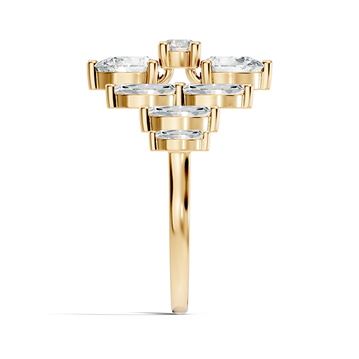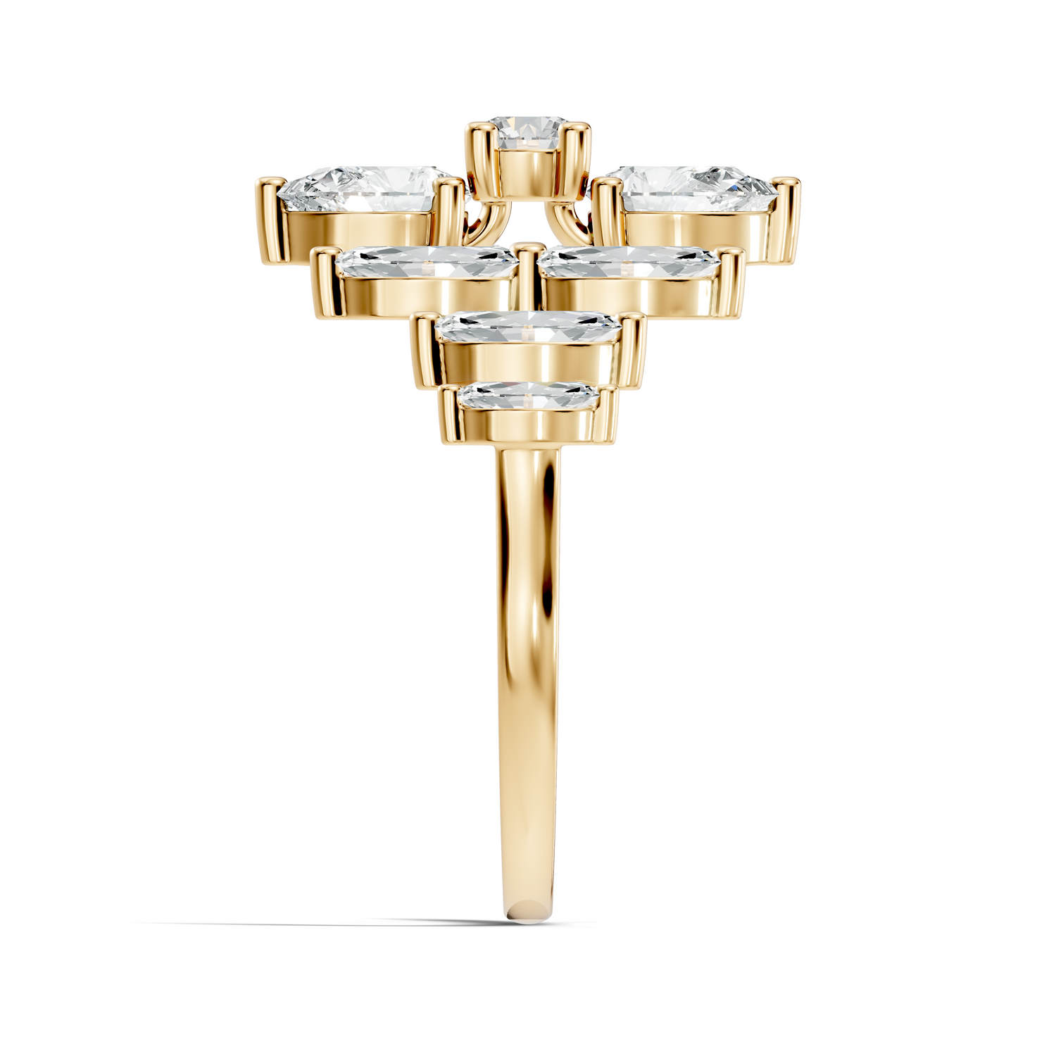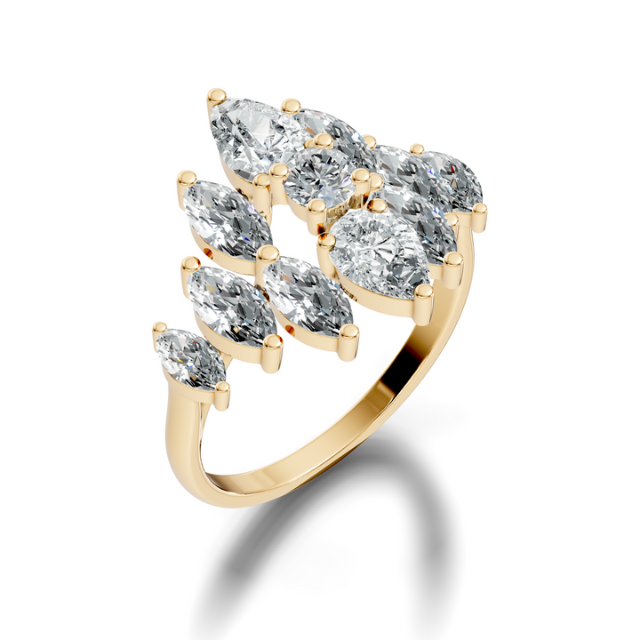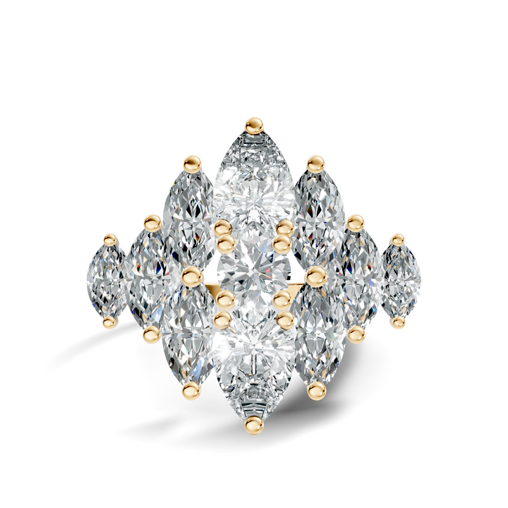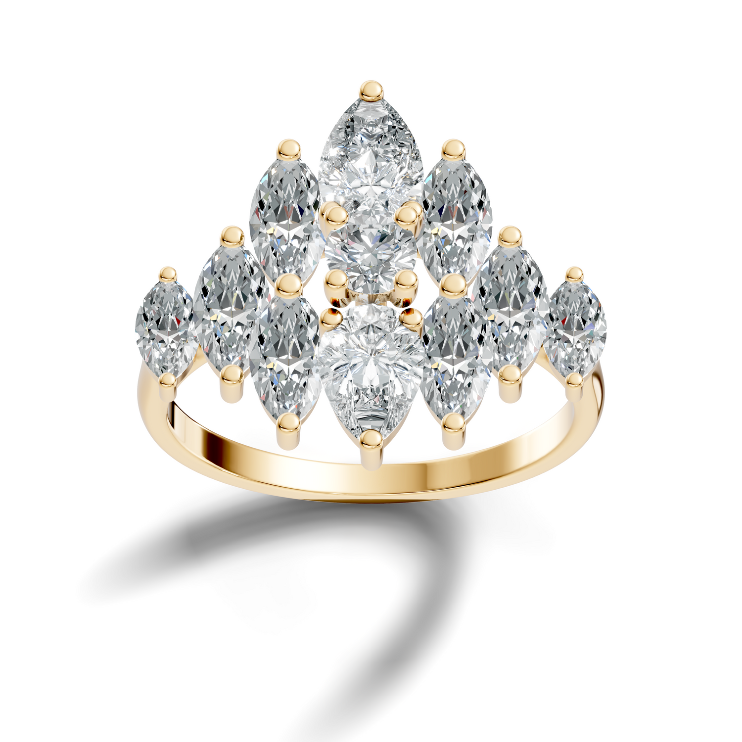 Handcrafted in 10K yellow gold, featuring lab-grown marquise, pear, and round-cut diamonds, total carat weight 3.17 Ct, cluster prong setting, standard ring size. Customize any piece in 10K, 14K, or 18K yellow, rose, or white gold, with your choice of lab-grown or natural diamonds where applicable.