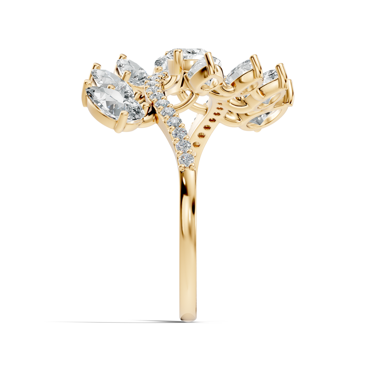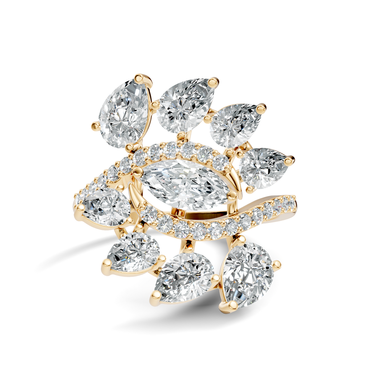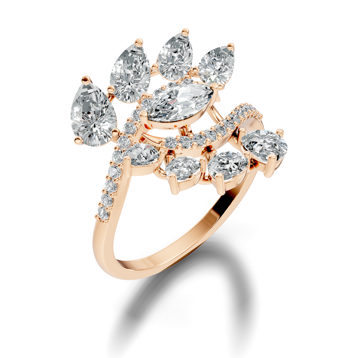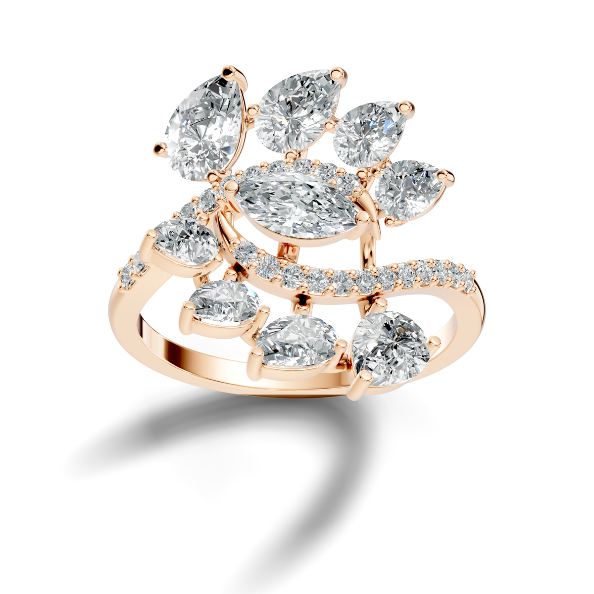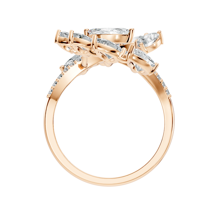 Handcrafted in 10K rose gold, featuring lab-grown marquise, pear, and round-cut diamonds, total carat weight 2.30 Ct, vintage prong cluster setting, standard ring size. Customize any piece in 10K, 14K, or 18K yellow, rose, or white gold, with your choice of lab-grown or natural diamonds where applicable.