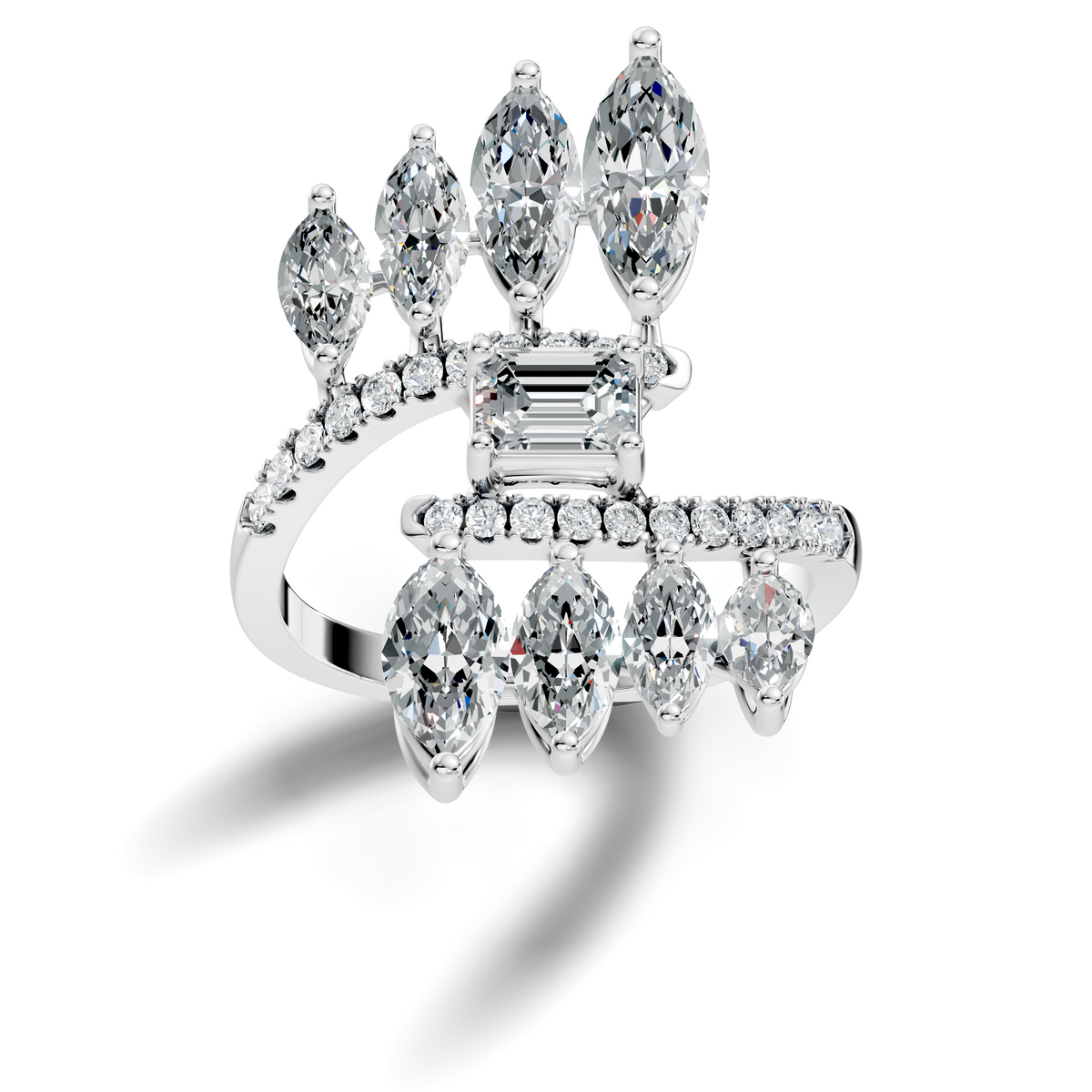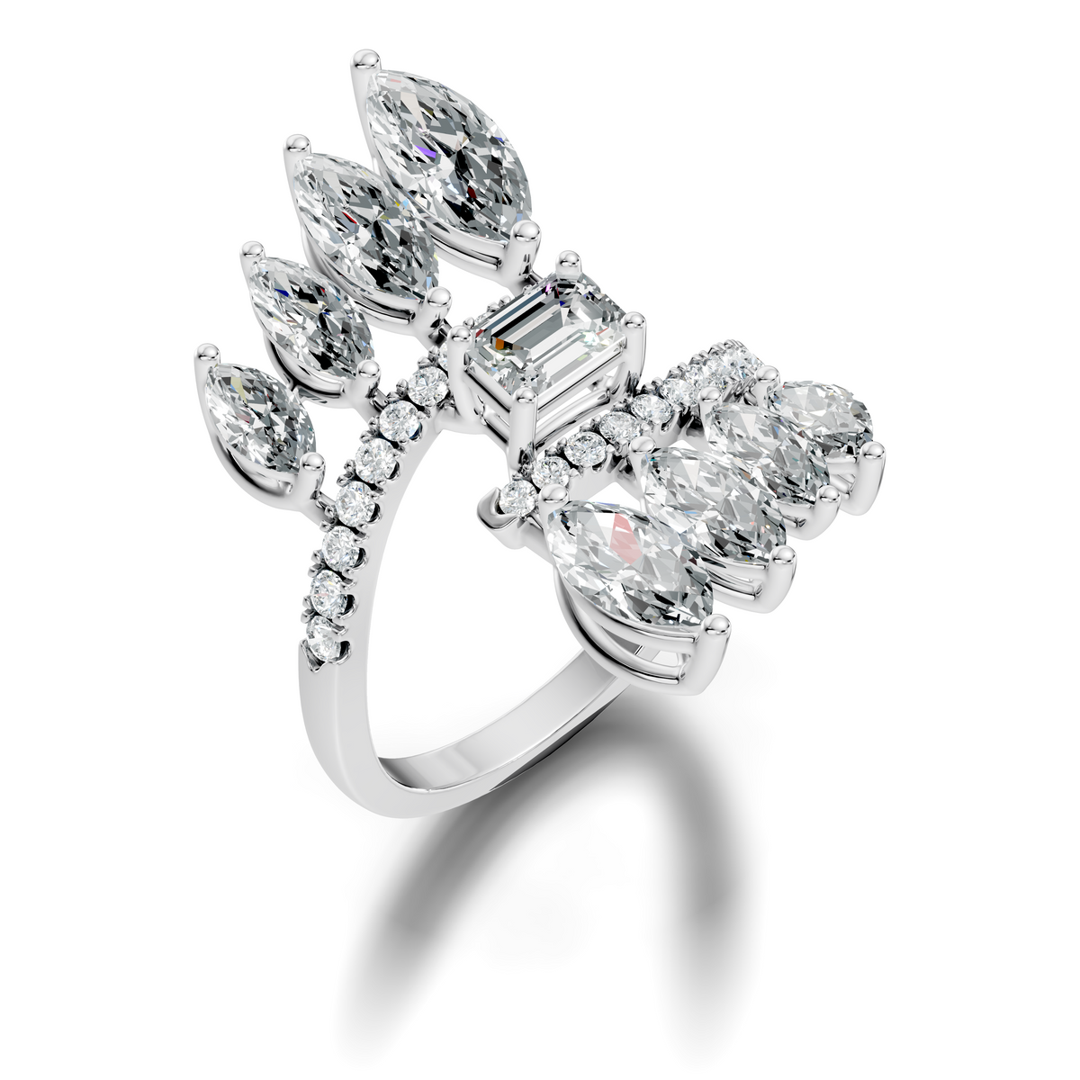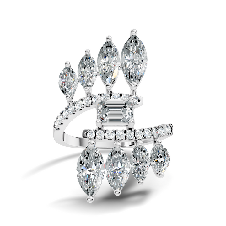 Handcrafted in 10K white gold, featuring lab-grown emerald, marquise, and round-cut diamonds, total carat weight 2.30 Ct, vintage prong cluster setting, standard ring size. Customize any piece in 10K, 14K, or 18K yellow, rose, or white gold, with your choice of lab-grown or natural diamonds where applicable.