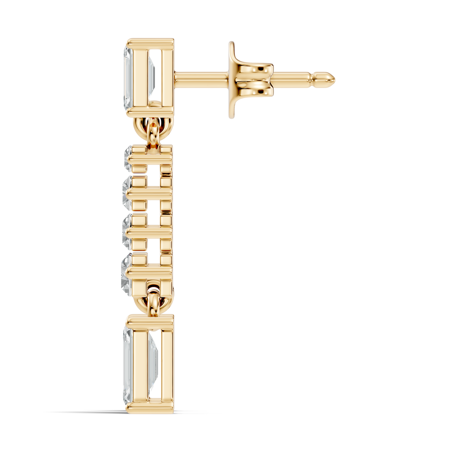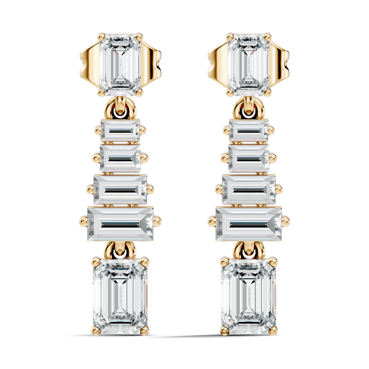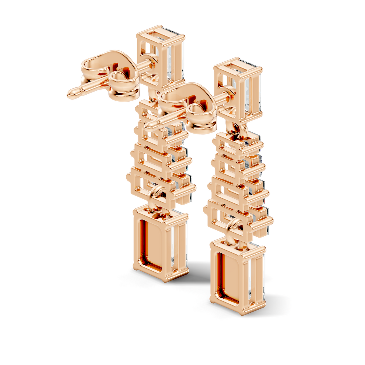 Handcrafted in 10K rose gold, featuring lab-grown pear, emerald, and baguette-cut diamonds, total carat weight 3.09 Ct, straight drop prong setting, friction back studs. Customize any piece in 10K, 14K, or 18K yellow, rose, or white gold, with your choice of lab-grown or natural diamonds where applicable.
