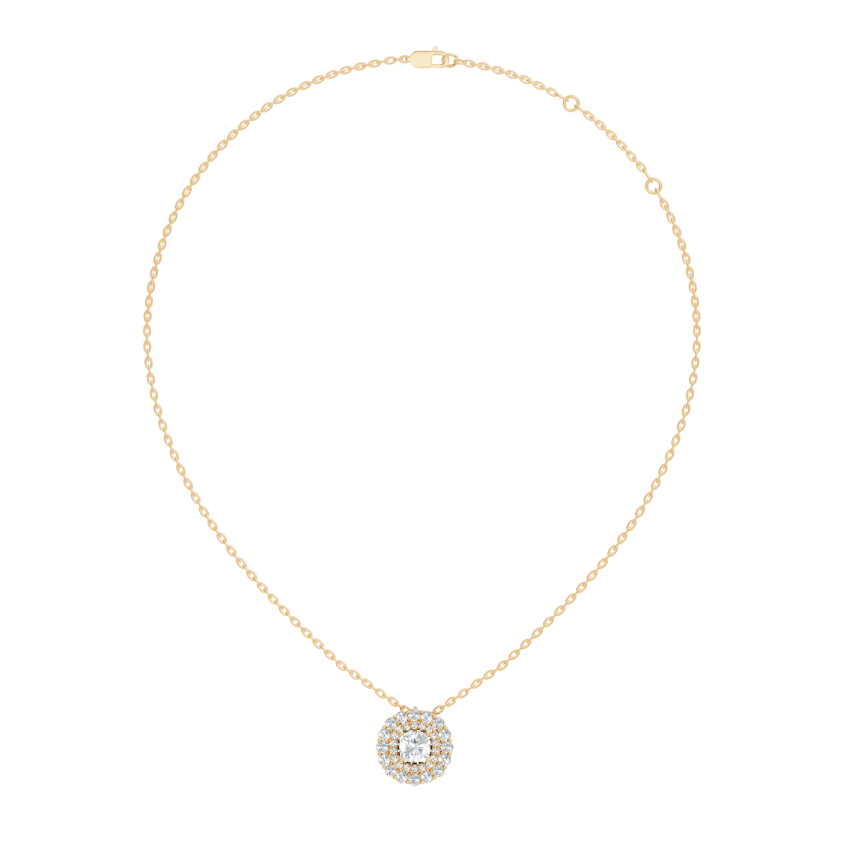 Handcrafted in 10K white gold, featuring lab-grown cushion and round-cut diamonds, total carat weight 1.62 Ct, halo pendant prong setting, standard chain length 18 inches. Customize any piece in 10K, 14K, or 18K yellow, rose, or white gold, with your choice of lab-grown or natural diamonds where applicable.