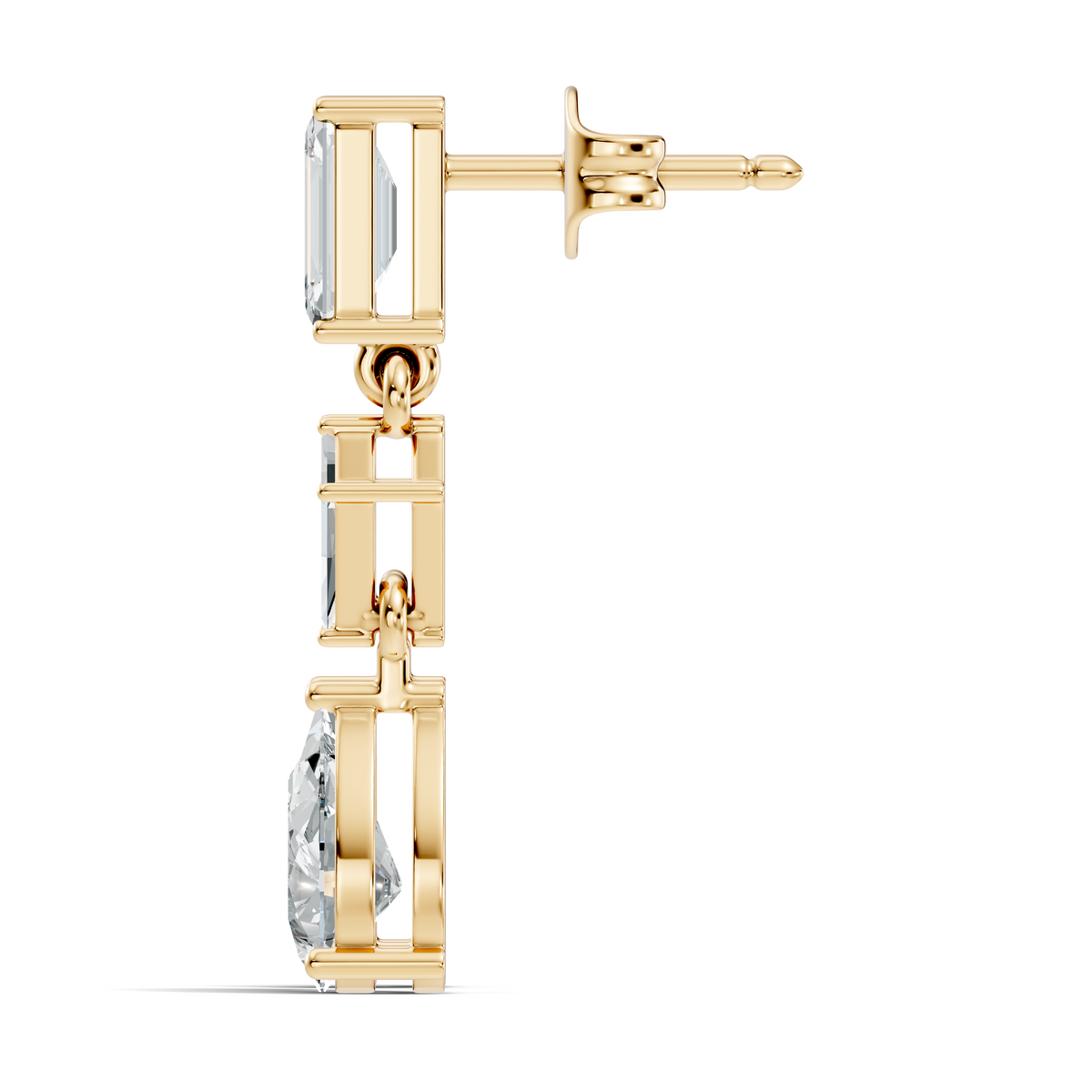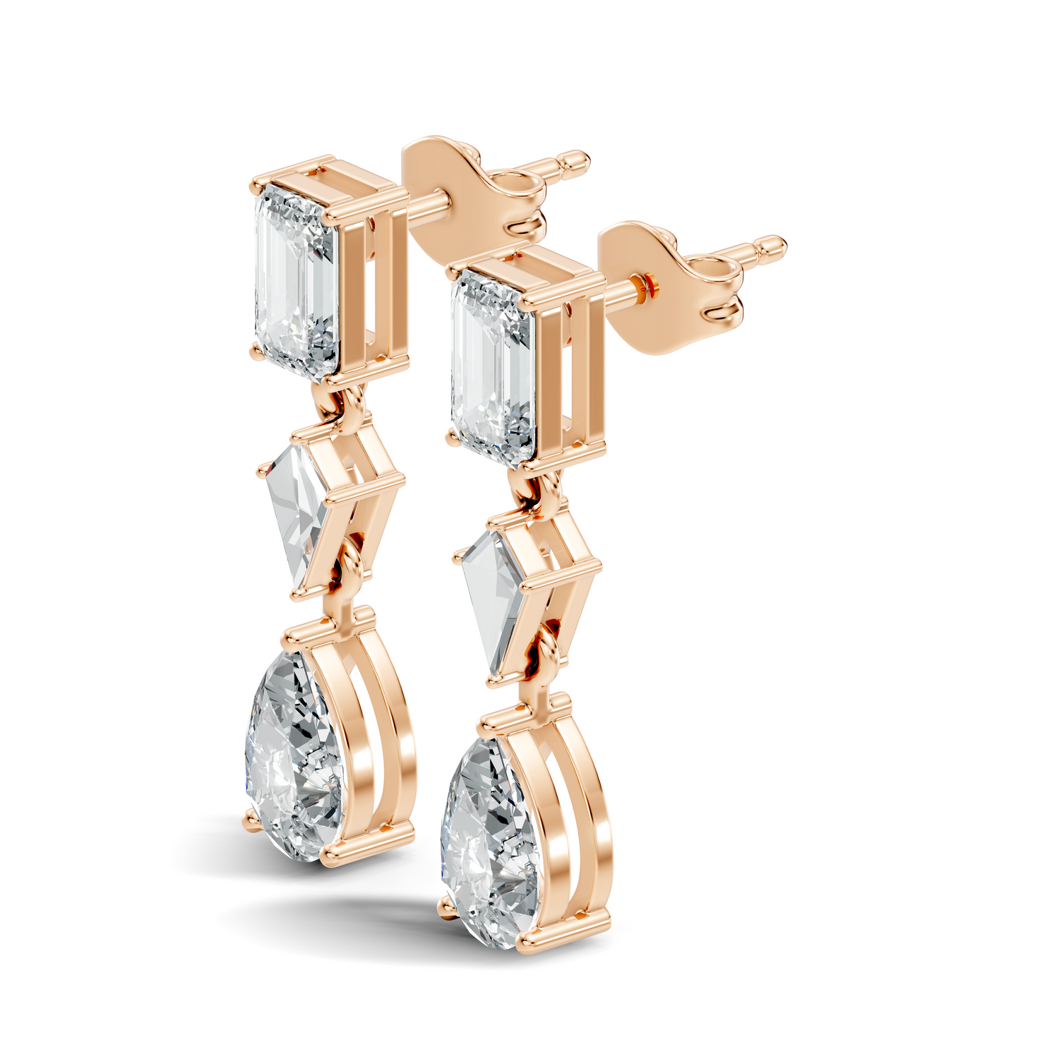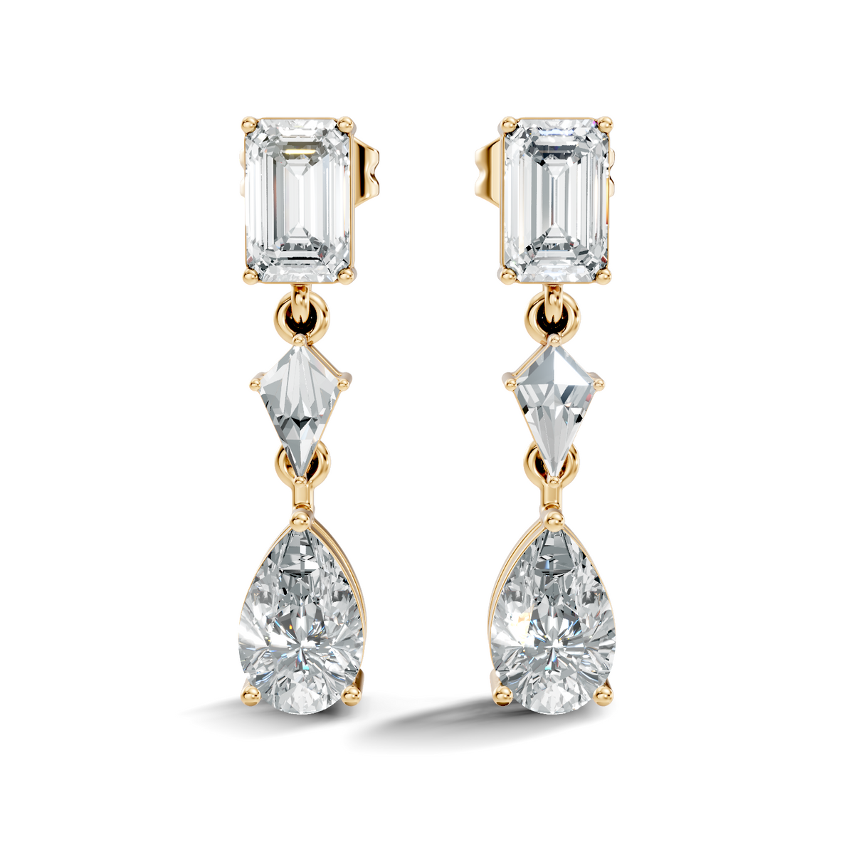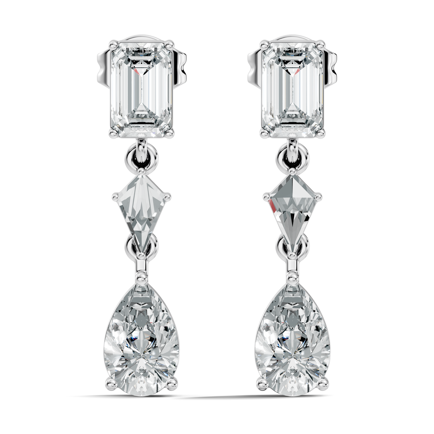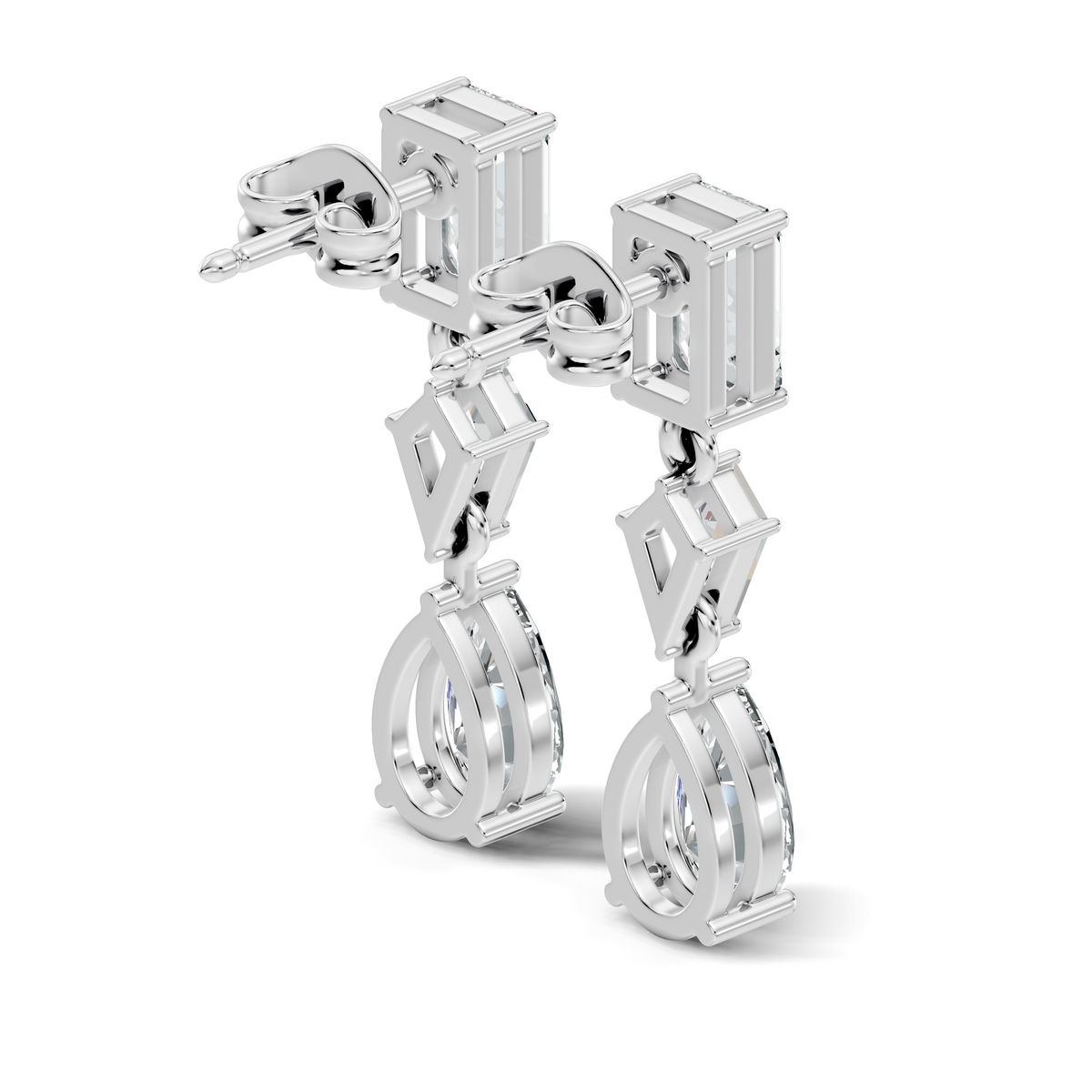 Handcrafted in 10K white gold, featuring lab-grown princess, pear, and emerald-cut diamonds, total carat weight 2.96 Ct, drop stud prong setting, friction back studs. Customize any piece in 10K, 14K, or 18K yellow, rose, or white gold, with your choice of lab-grown or natural diamonds where applicable.