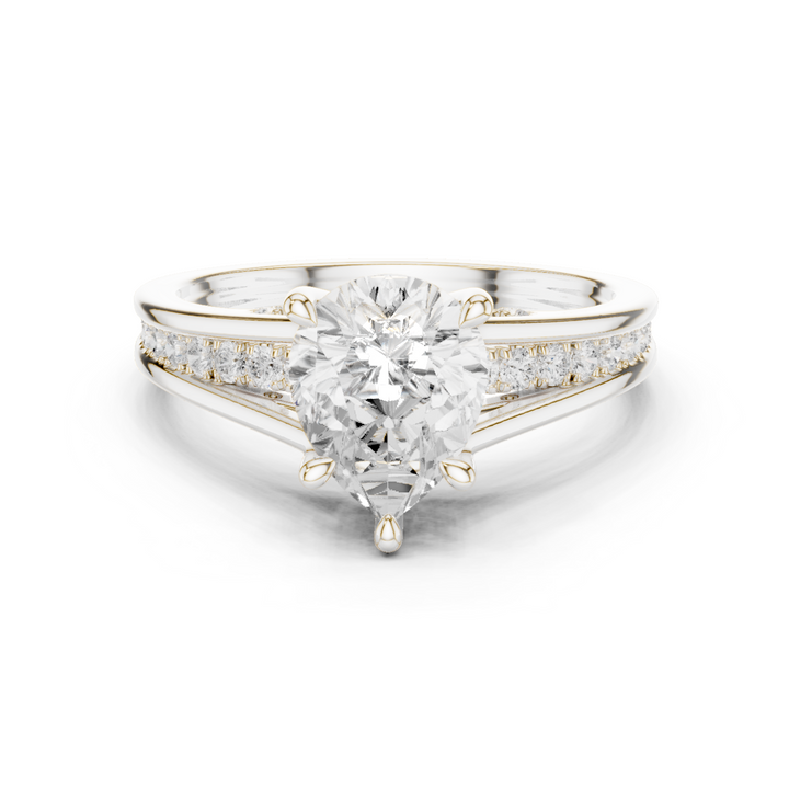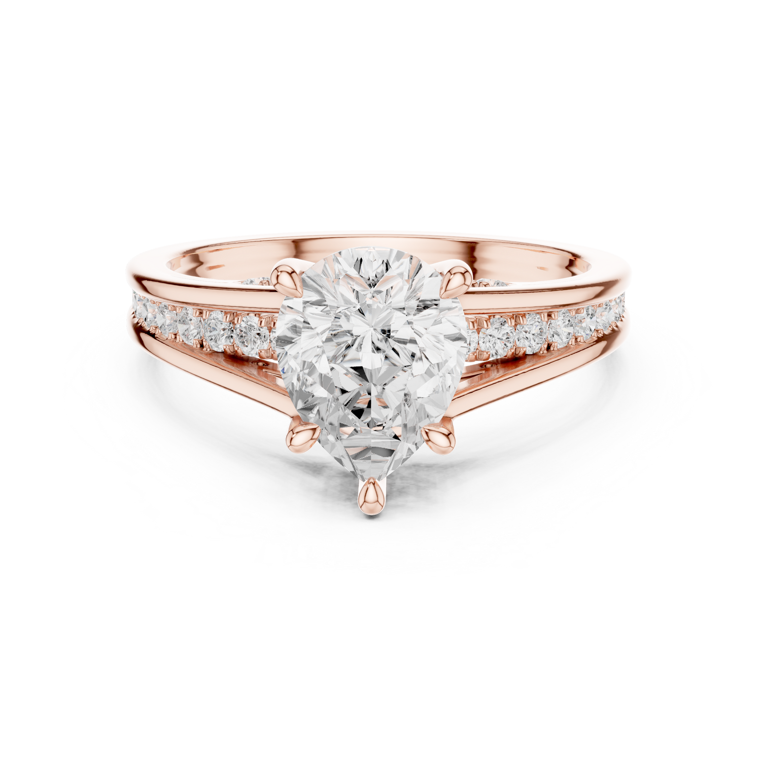 Handcrafted in 10K rose gold with 2.29 Ct pear-cut center diamond and round-cut side stones, prong setting for secure and lasting wear. Customize any piece in 10K, 14K, or 18K yellow, rose, or white gold, with your choice of lab-grown or natural diamonds where applicable.