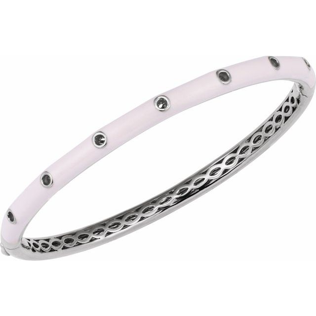 This is an unset bangle bracelet mounting crafted from polished 14K white gold with Pink Enamel. It is designed for round stones of 1.9 mm and has a diamond total weight allowance of 1/5 Ctw. The bracelet has a fixed length of 7 inches. Customize any piece in 10K, 14K, or 18K yellow, rose, or white gold, with your choice of lab-grown or natural diamonds where applicable.