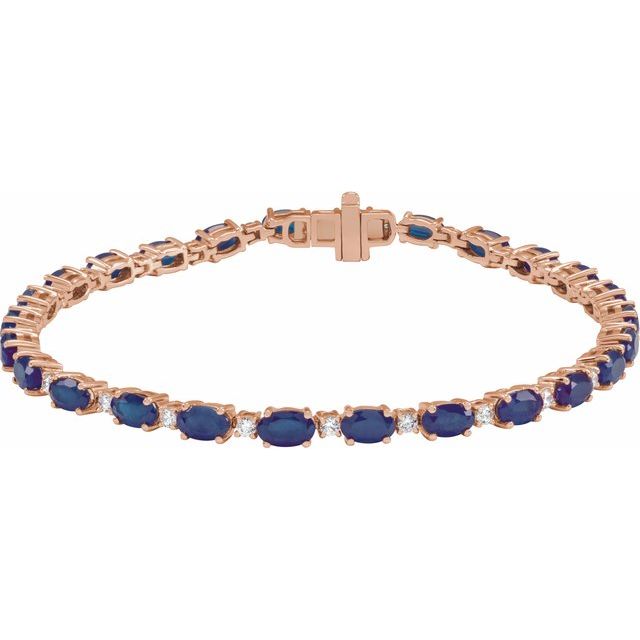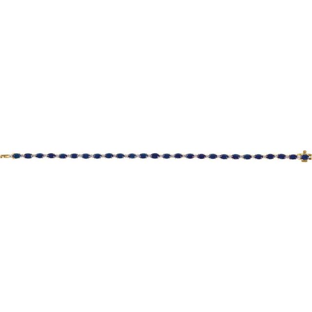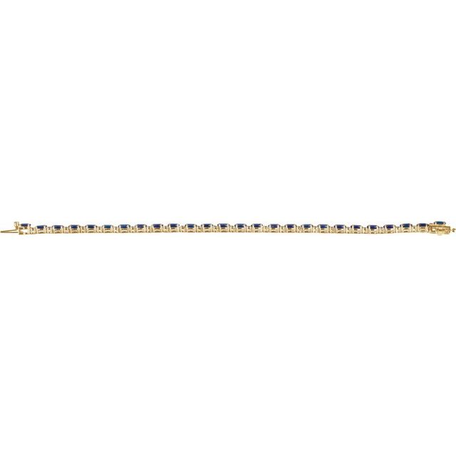 This line bracelet is crafted from polished 14K yellow gold and is set with 5 x 3 mm Lab-Grown Blue Sapphire stones and Lab-Grown Diamonds with a total diamond weight of 5/8 Ctw (G-H color, SI1-SI2 clarity). The bracelet has a fixed length of 7 inches. Customize any piece in 10K, 14K, or 18K yellow, rose, or white gold, with your choice of lab-grown or natural diamonds where applicable.