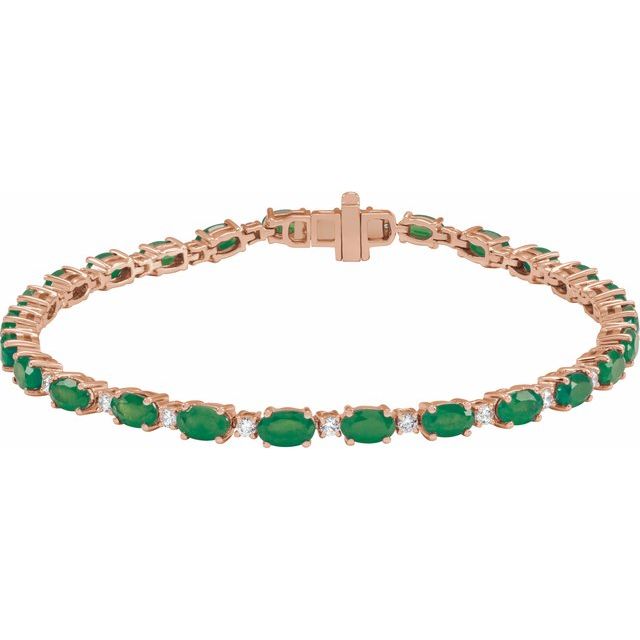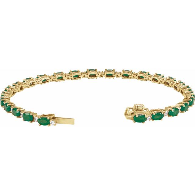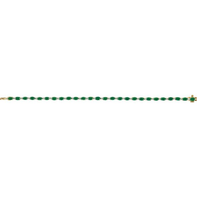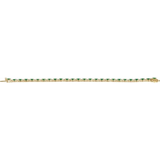 This line bracelet is crafted from polished 14K yellow gold and is set with 5 x 3 mm Lab-Grown Emerald stones and Lab-Grown Diamonds with a total diamond weight of 5/8 Ctw (G-H color, SI1-SI2 clarity). The bracelet has a fixed length of 7 inches. Customize any piece in 10K, 14K, or 18K yellow, rose, or white gold, with your choice of lab-grown or natural diamonds where applicable.