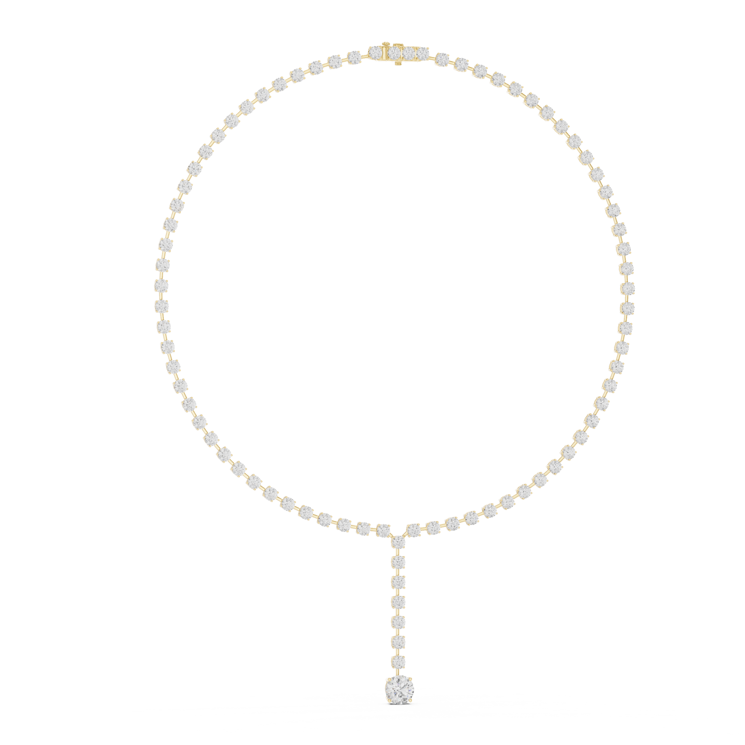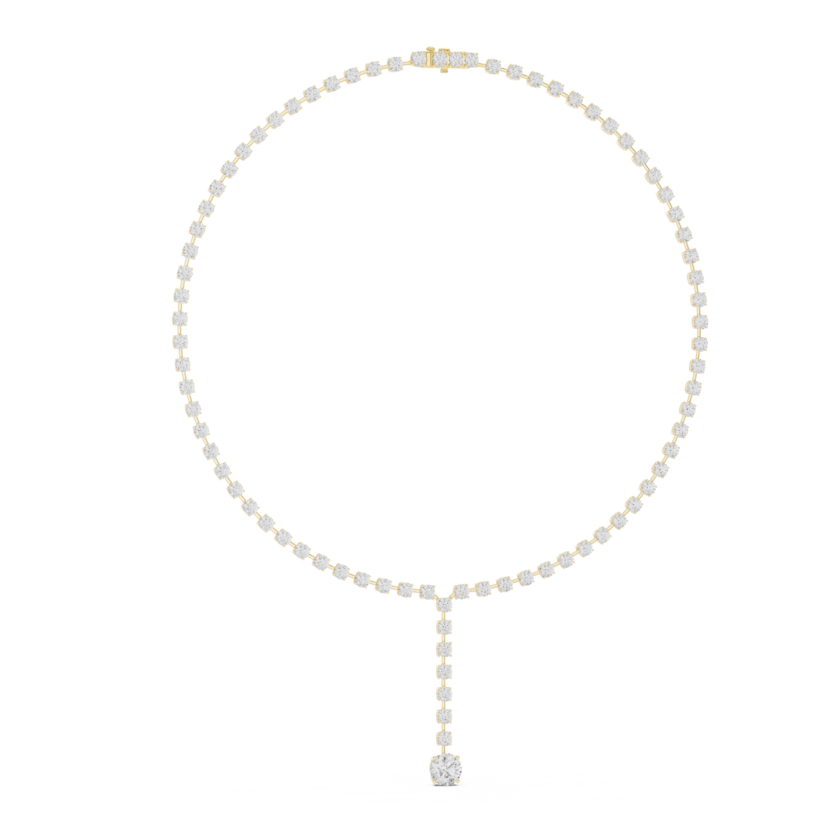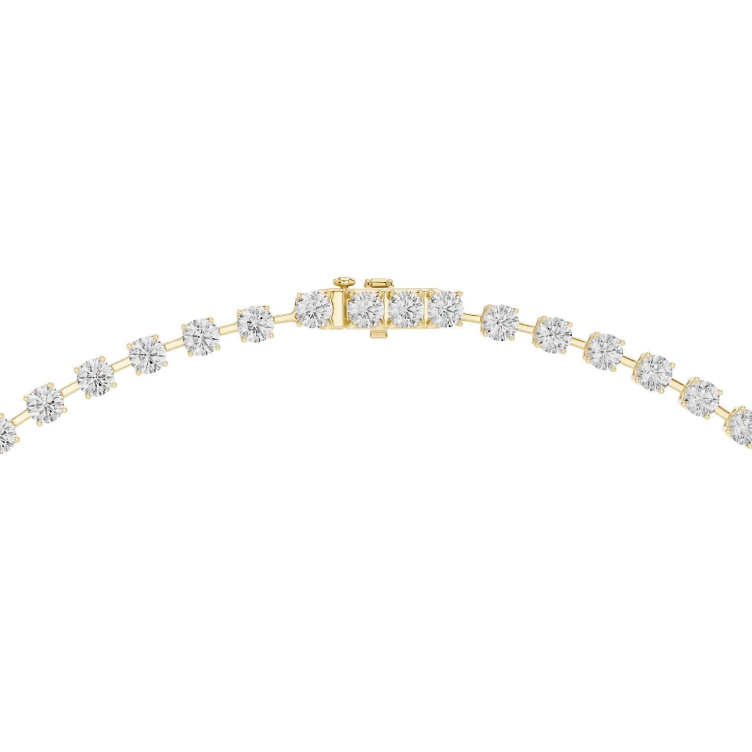 This tennis necklace is crafted from 10K yellow gold and features a 27.00 Ct round lab grown diamond set in solid 14K gold. Customize any piece in 10K, 14K, or 18K yellow, rose, or white gold, with your choice of lab-grown or natural diamonds where applicable.
