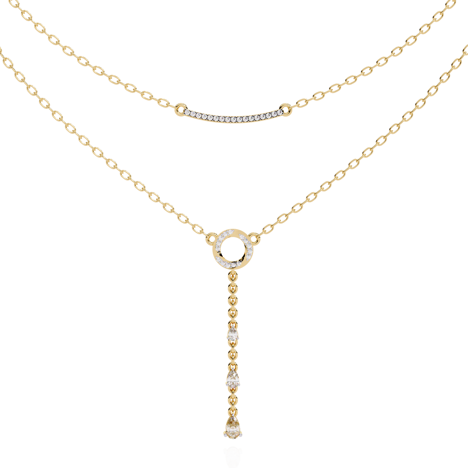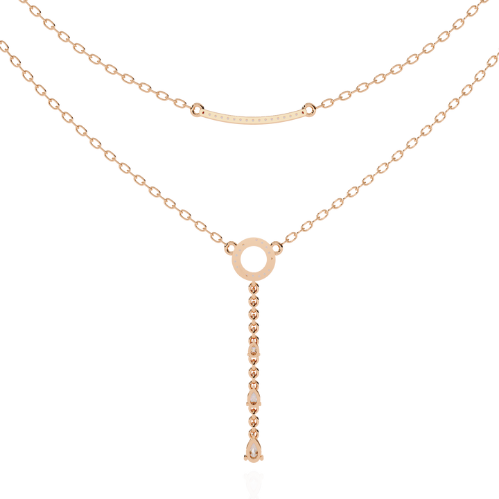 This multi layer necklace is crafted from solid 10K rose gold and features a blend of Pear and Round Cut Lab Grown & Natural Diamonds set in solid 10K white gold. Customize any piece in 10K, 14K, or 18K yellow, rose, or white gold, with your choice of lab-grown or natural diamonds where applicable.
