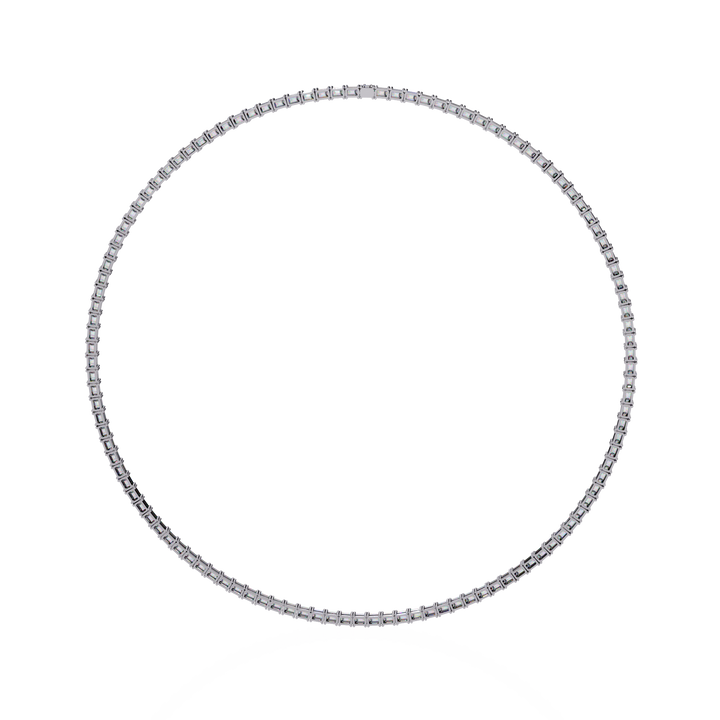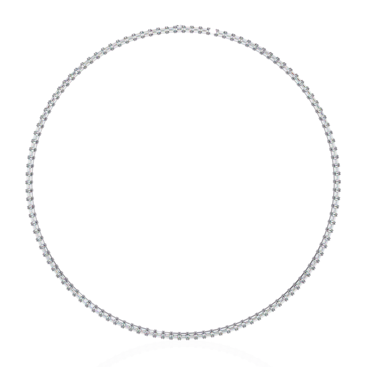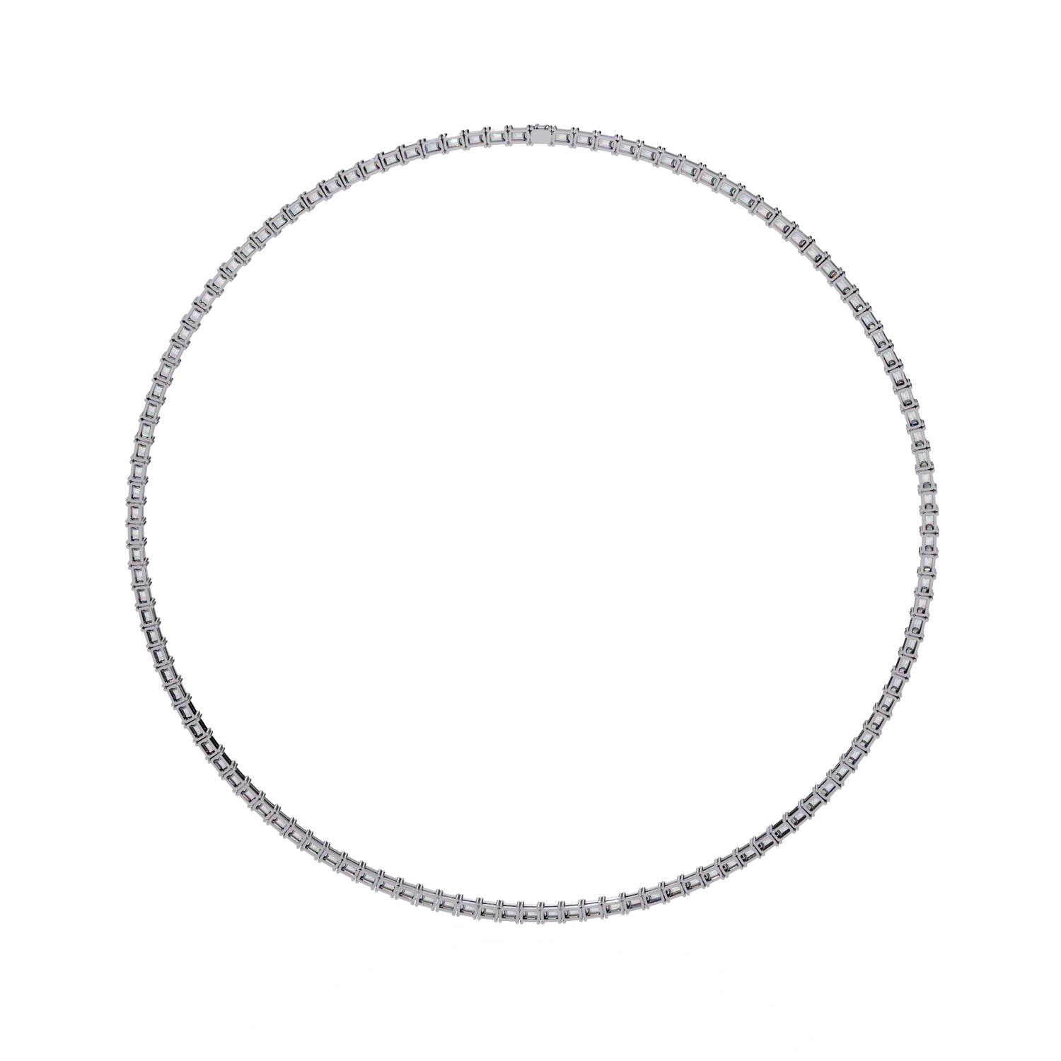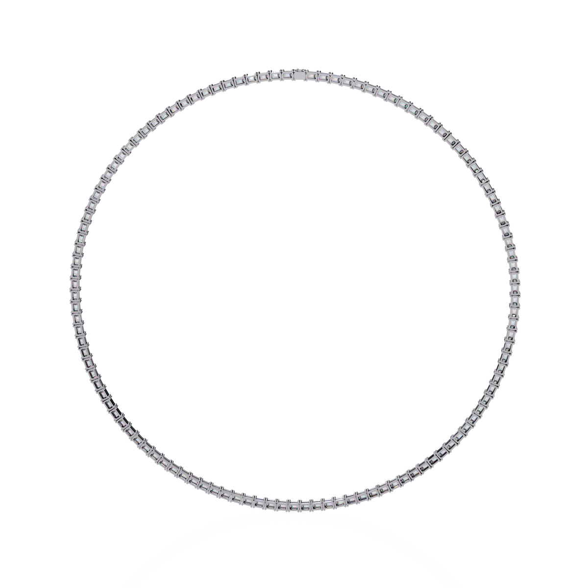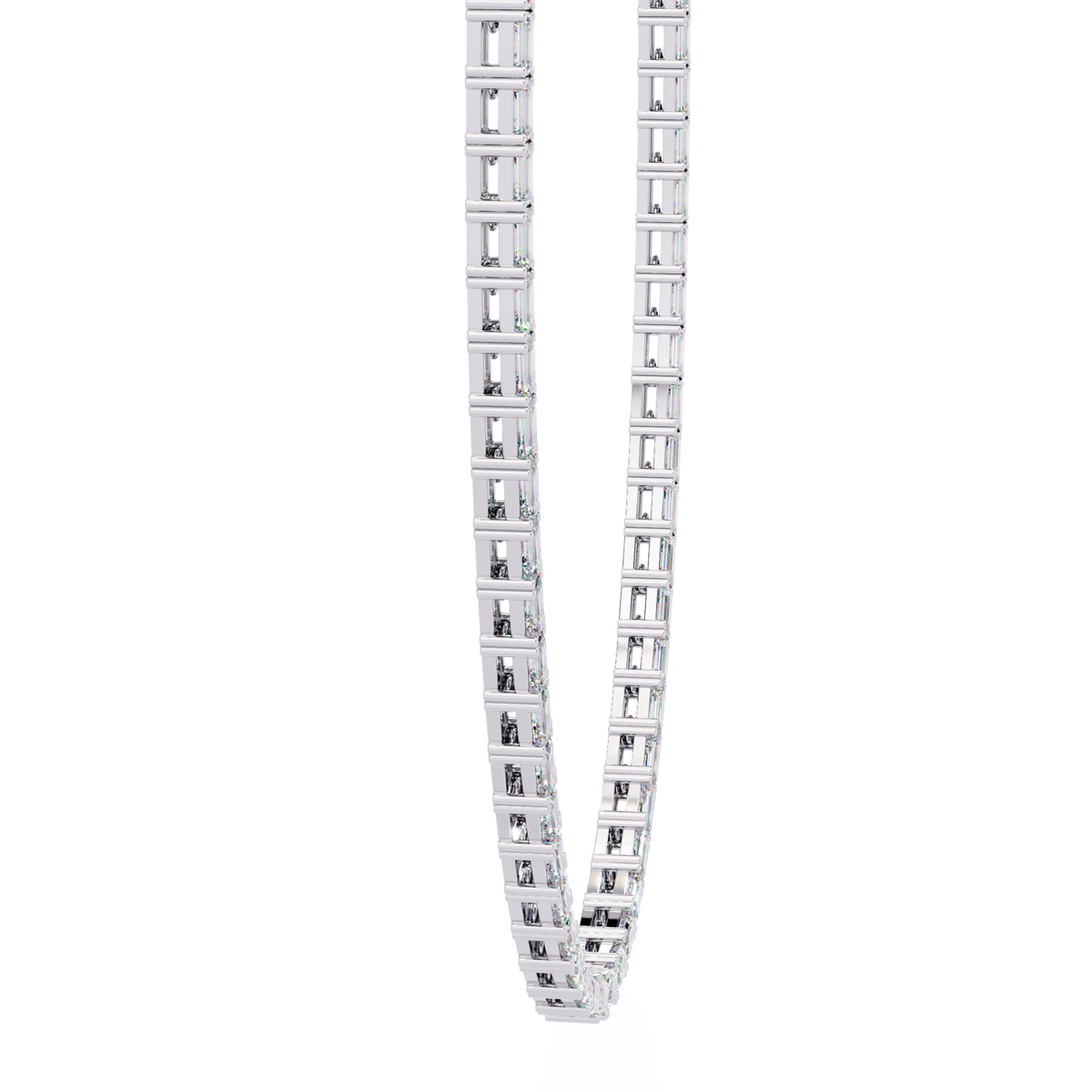 This Emerald-Cut Lab-grown Diamond Tennis Necklace by High Carat is a handcrafted minimalist tennis necklace featuring a stunning emerald-cut lab-grown diamond. This unique piece in cool white gold is perfect for women who appreciate occasional luxury. Its sleek, contemporary design allows for effortless style elevation, offering a modern take on a classic silhouette.