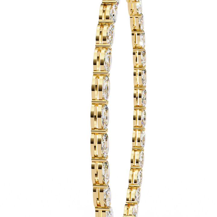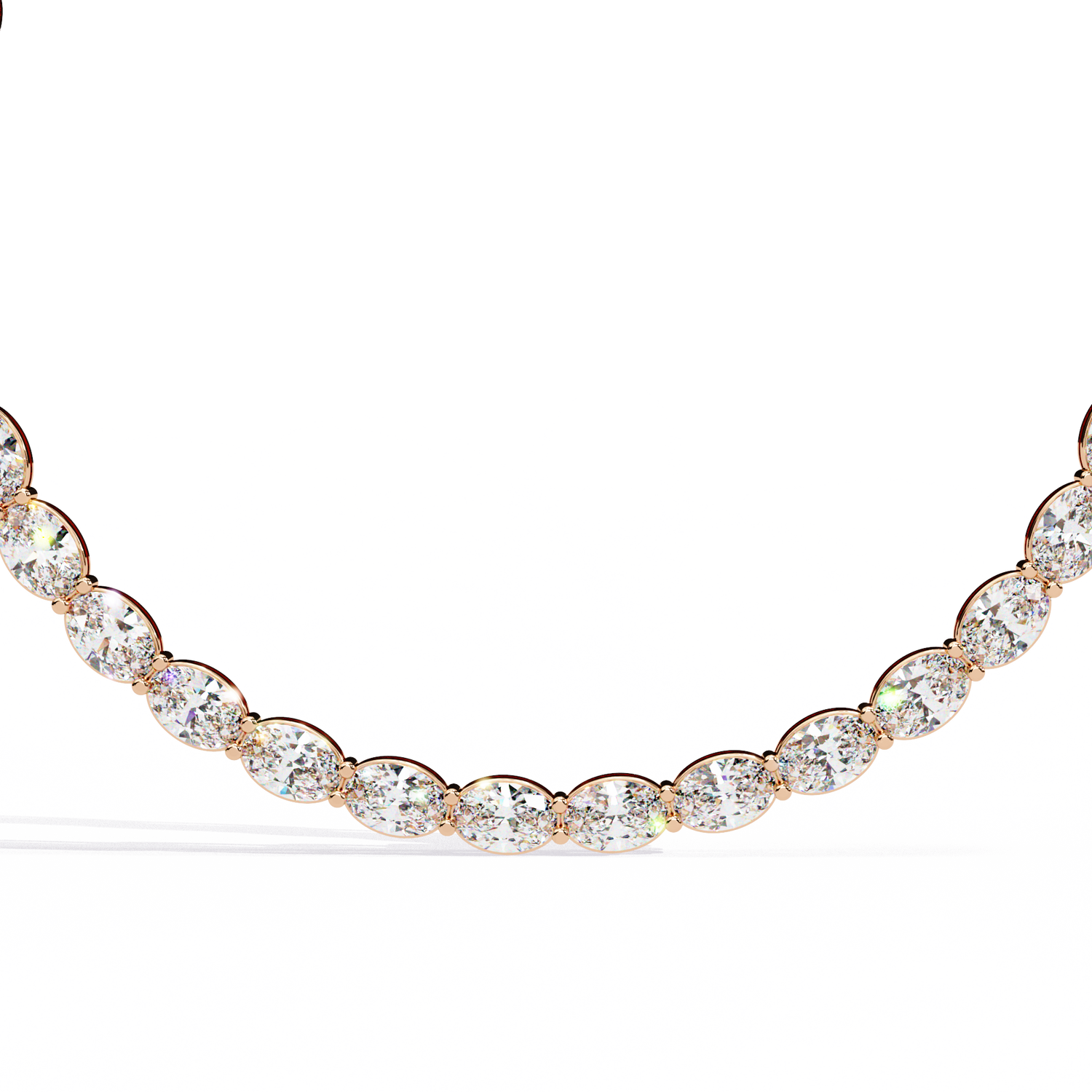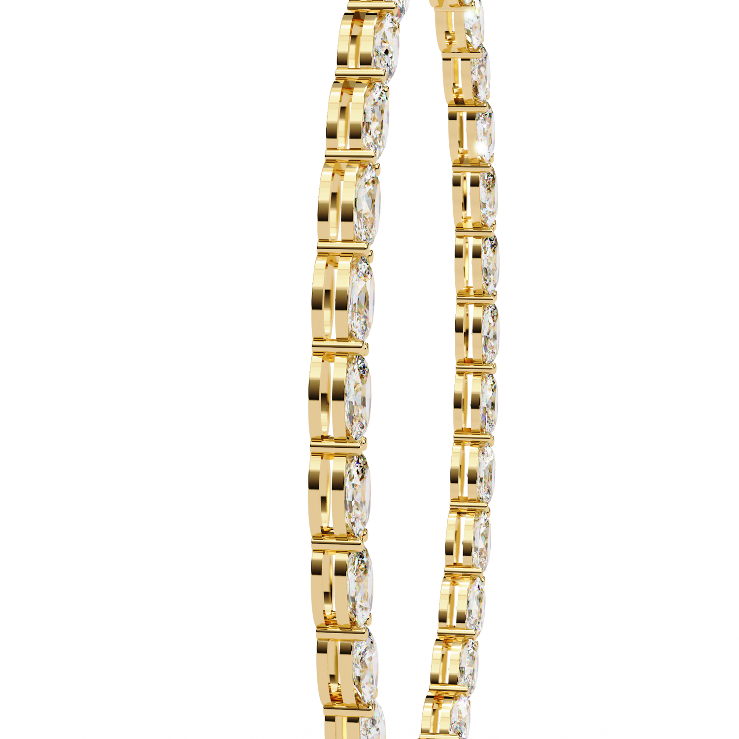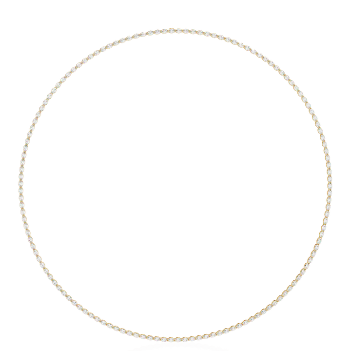 This tennis necklace is crafted from solid 14K gold and features a 6.20 Ct oval cut Lab Grown and Natural Diamond in a channel set unique Art Deco design with prong setting. The metal is 10K yellow gold. Customize any piece in 10K, 14K, or 18K yellow, rose, or white gold, with your choice of lab-grown or natural diamonds where applicable.