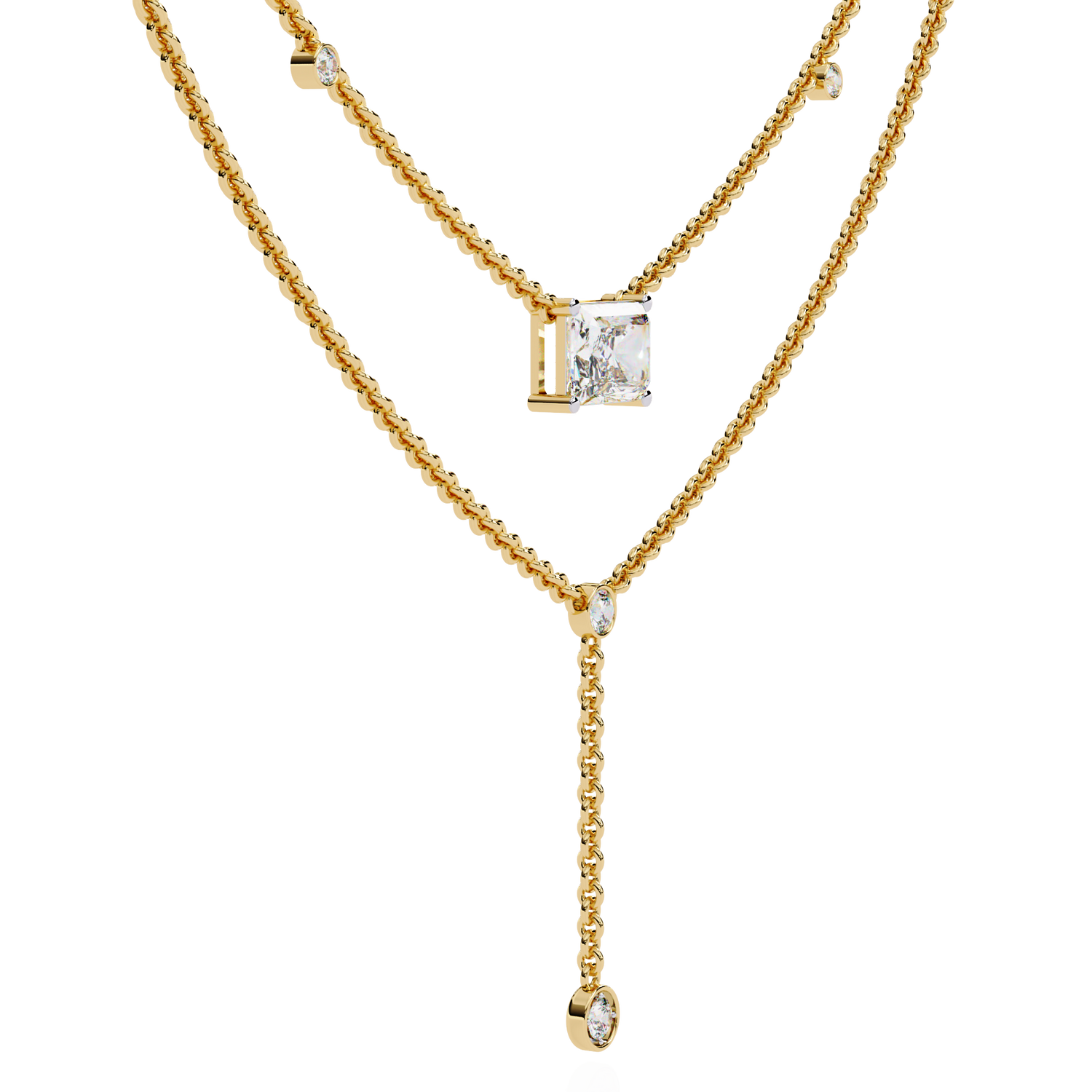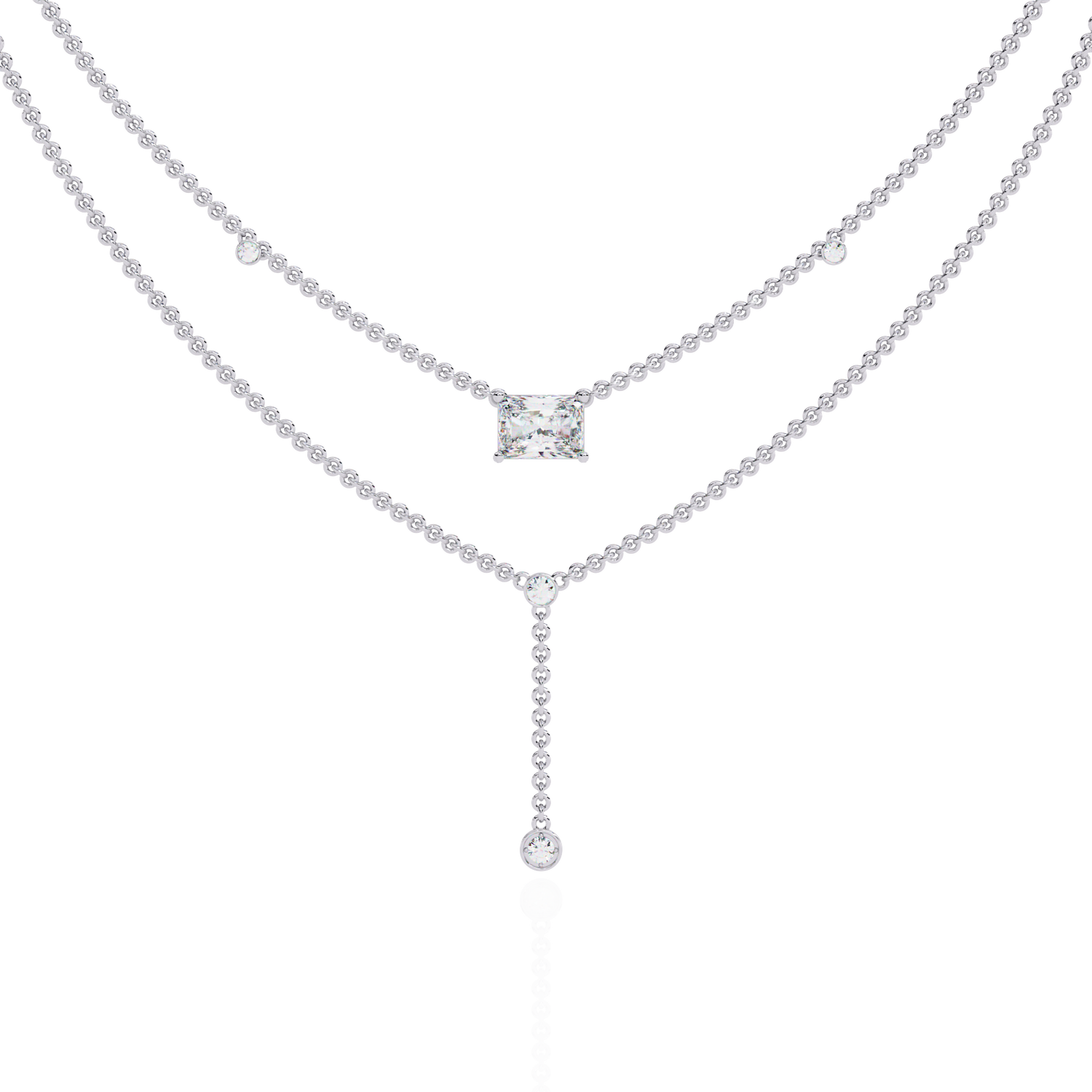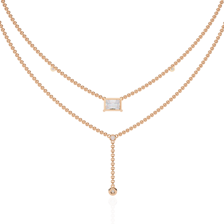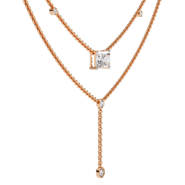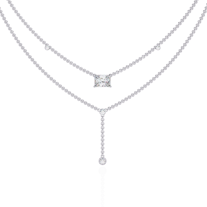 This multi layer necklace is crafted from 10K white gold and features a 1.72 ct radiant and round lab grown diamond in a solitaire cluster design set in solid 18K gold. Customize any piece in 10K, 14K, or 18K yellow, rose, or white gold, with your choice of lab-grown or natural diamonds where applicable.