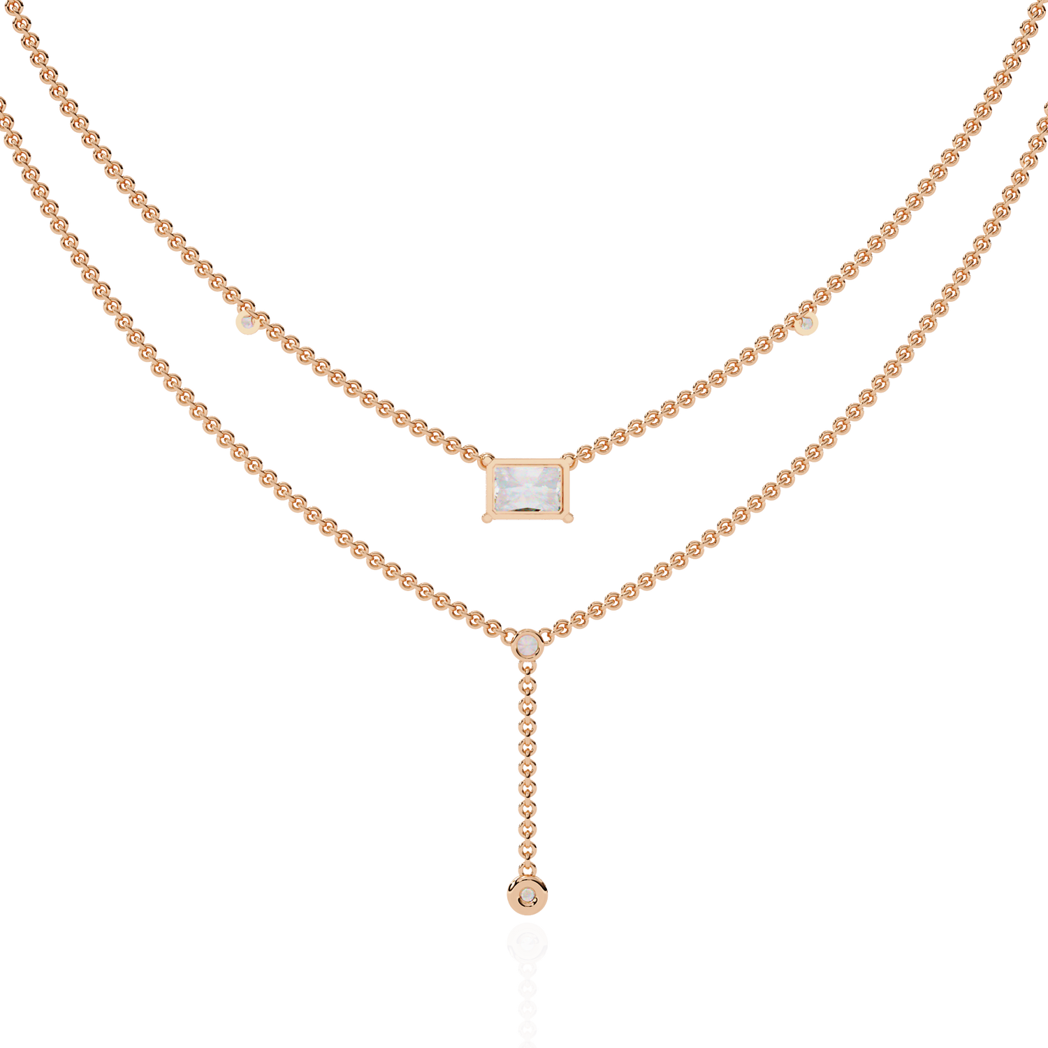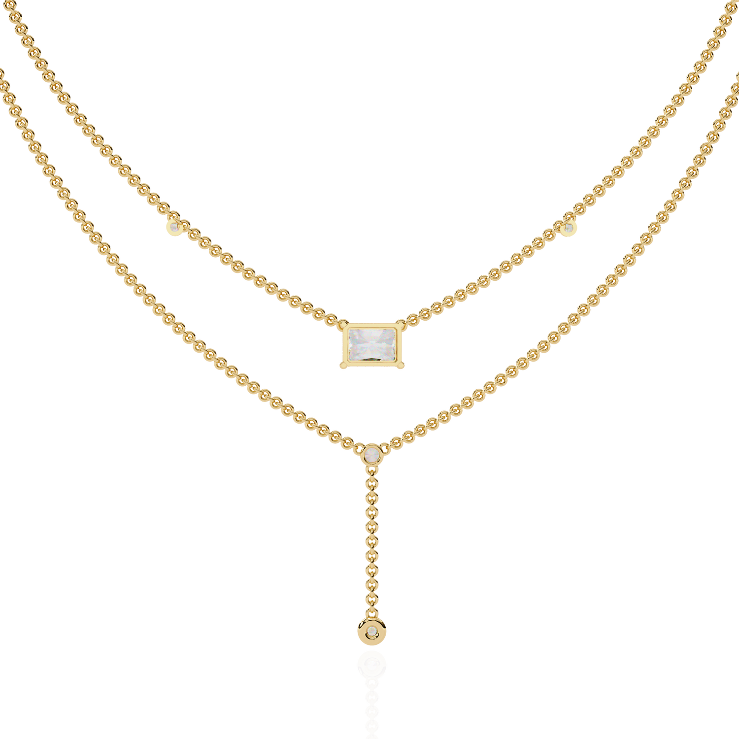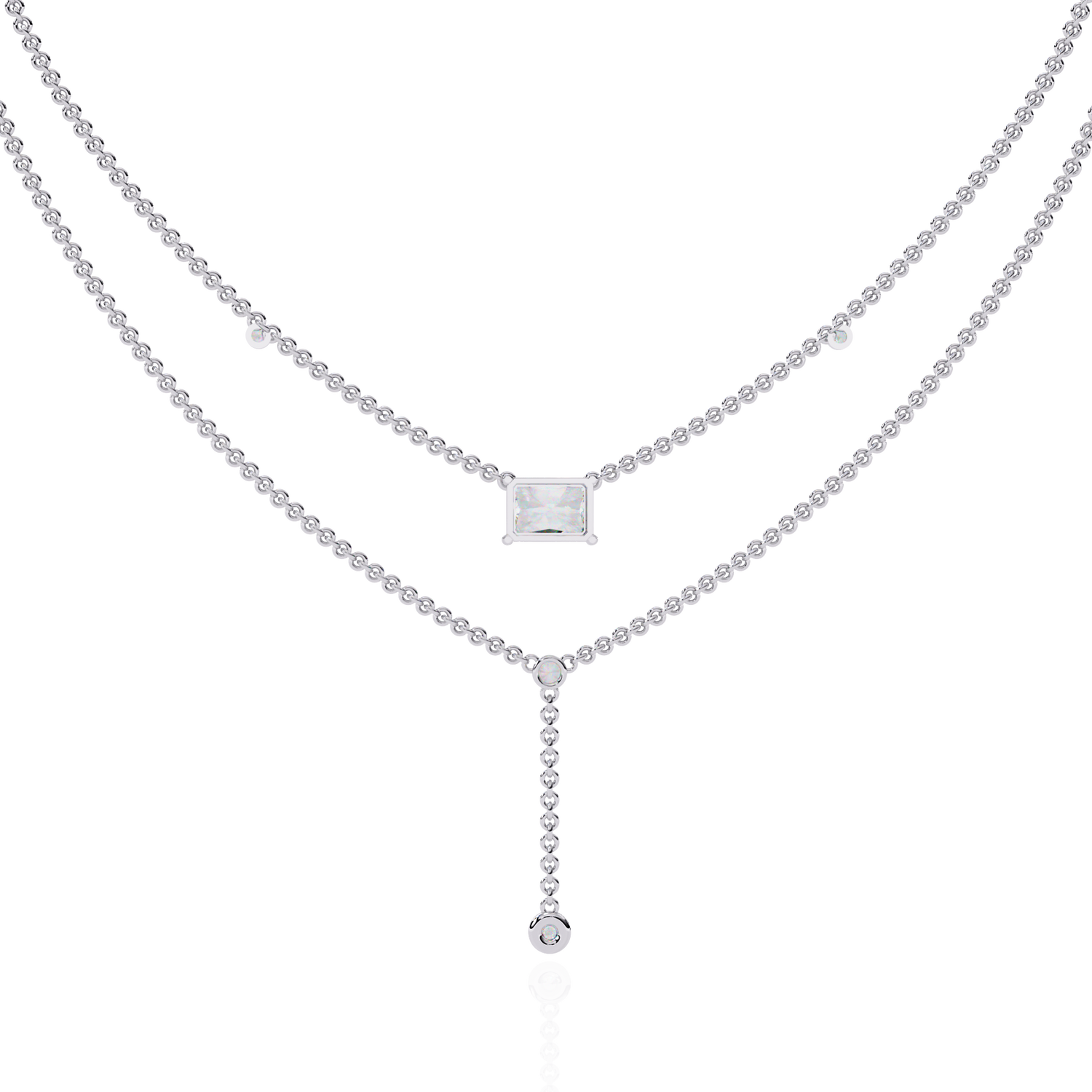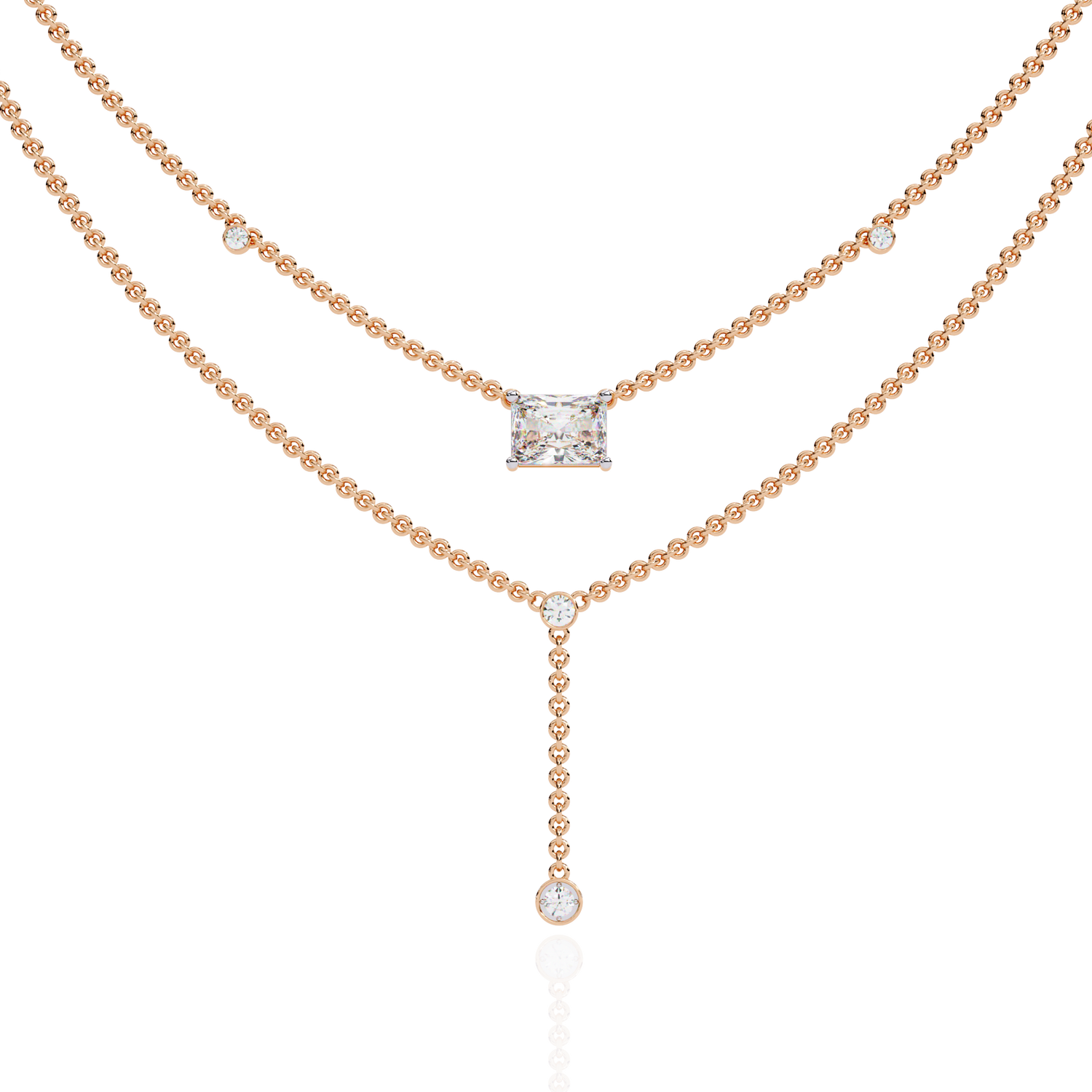 This multi layer necklace is crafted from 10K white gold and features a 1.72 ct radiant and round lab grown diamond in a solitaire cluster design set in solid 18K gold. Customize any piece in 10K, 14K, or 18K yellow, rose, or white gold, with your choice of lab-grown or natural diamonds where applicable.