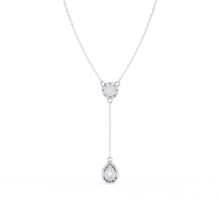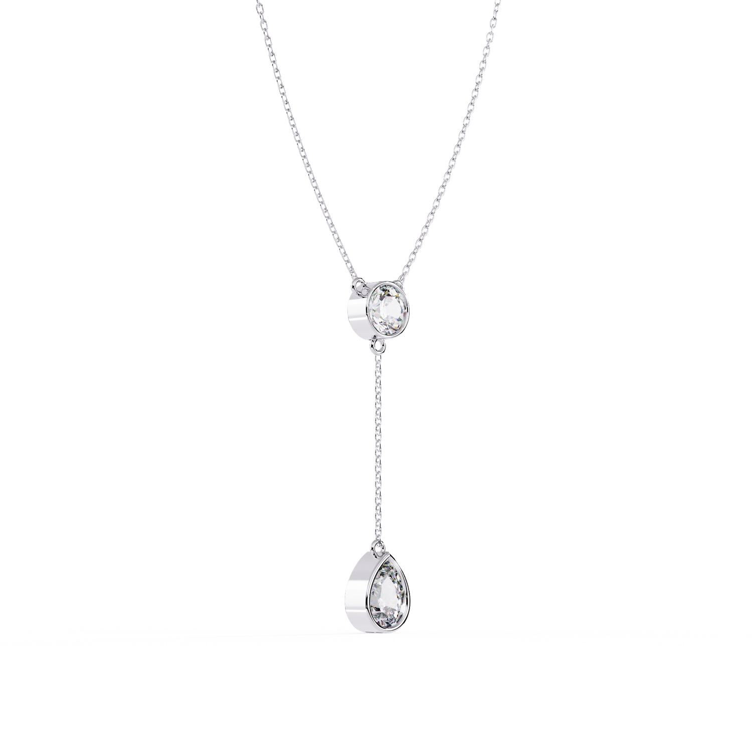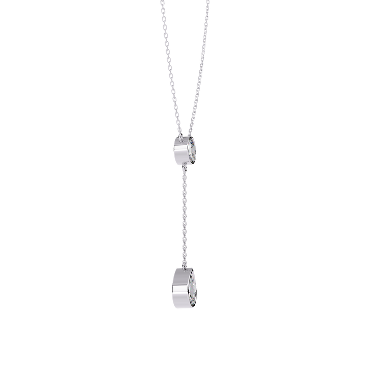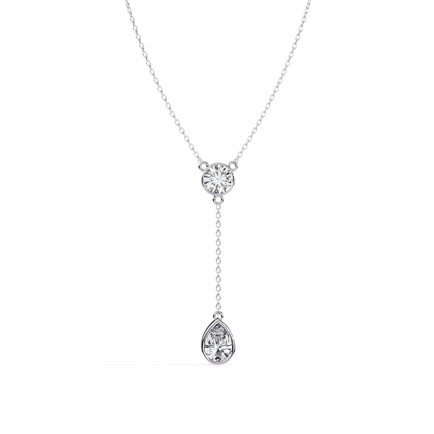 This Round-Cut Lab-grown Diamond Necklace by High Carat is an elegant minimalist necklace featuring a 1.13 CT combination of round and pear-cut lab-grown diamonds in a bezel-set design. Its antique-inspired, minimal yet sophisticated style in cool white gold is perfect for daily wear, adding a subtle sparkle to any outfit. This versatile piece blends classic charm with modern craftsmanship.