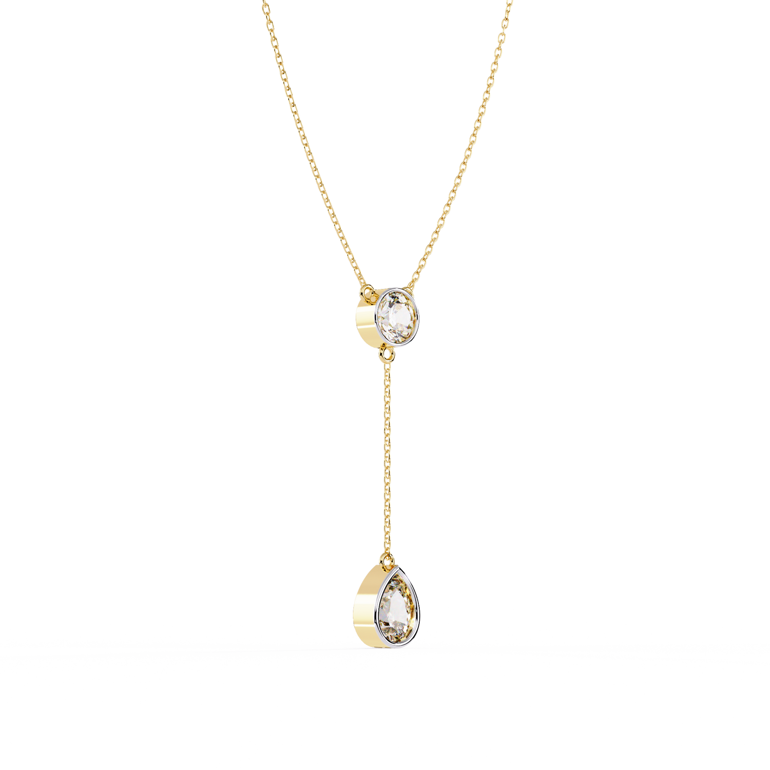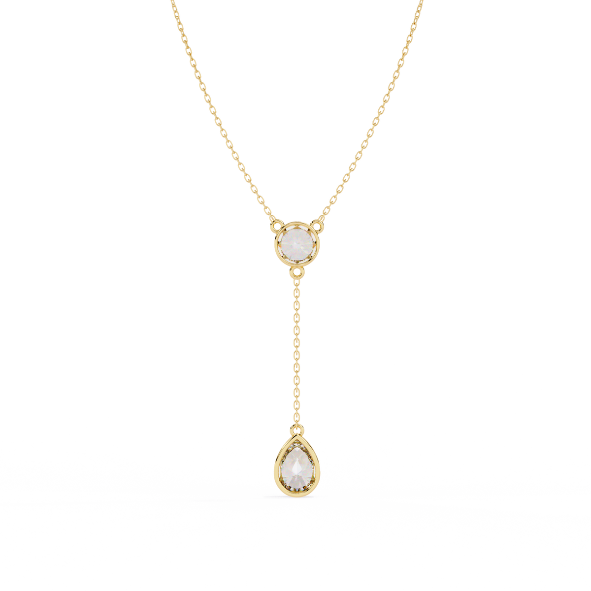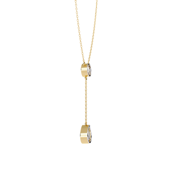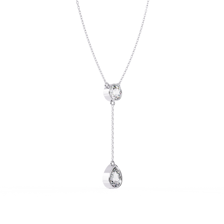 This Round-Cut Lab-grown Diamond Necklace by High Carat is an elegant minimalist necklace featuring a 1.13 CT combination of round and pear-cut lab-grown diamonds in a bezel-set design. Its antique-inspired, minimal yet sophisticated style in cool white gold is perfect for daily wear, adding a subtle sparkle to any outfit. This versatile piece blends classic charm with modern craftsmanship.