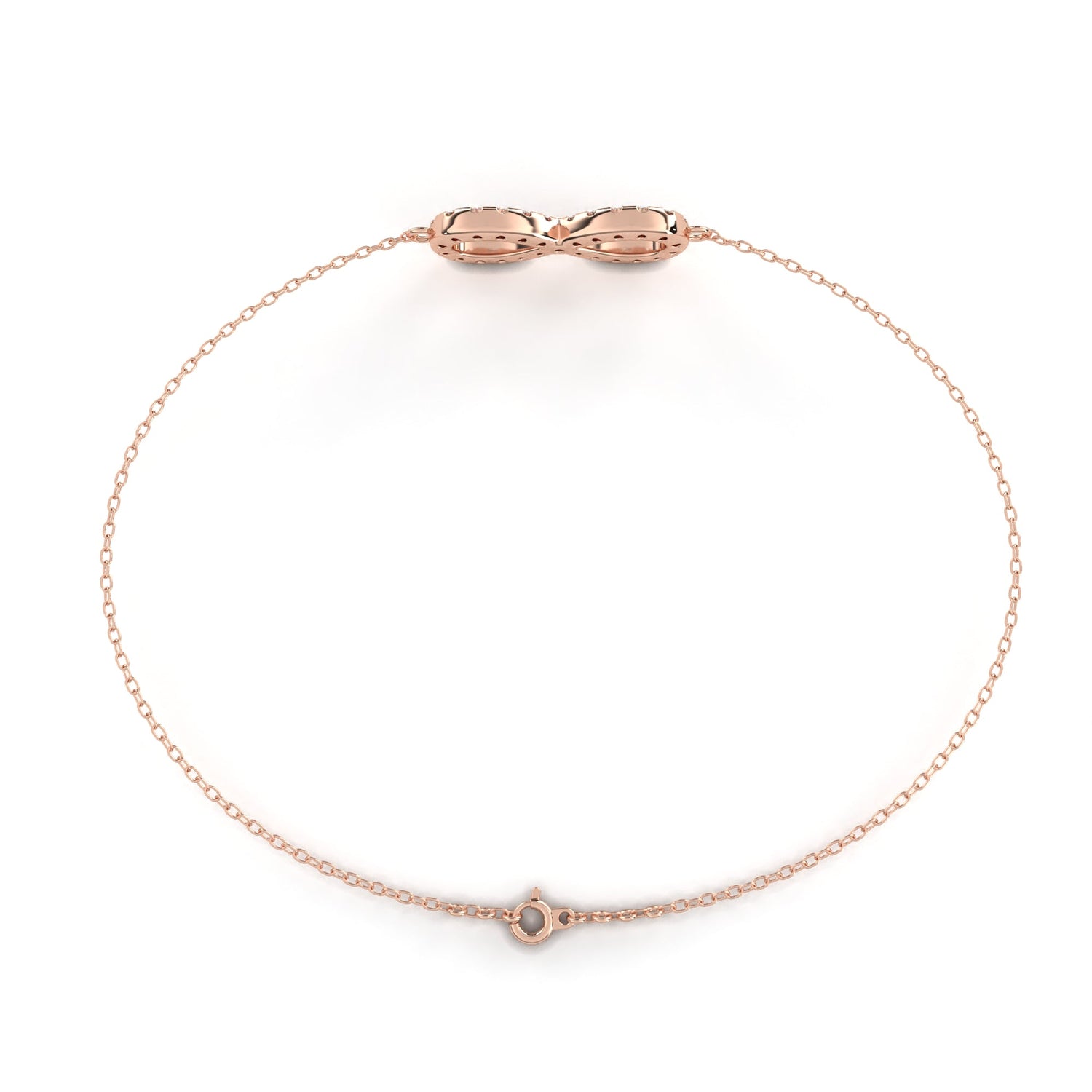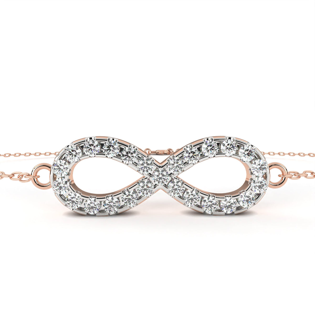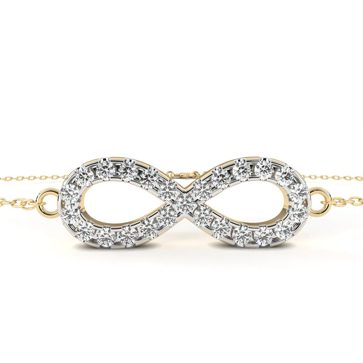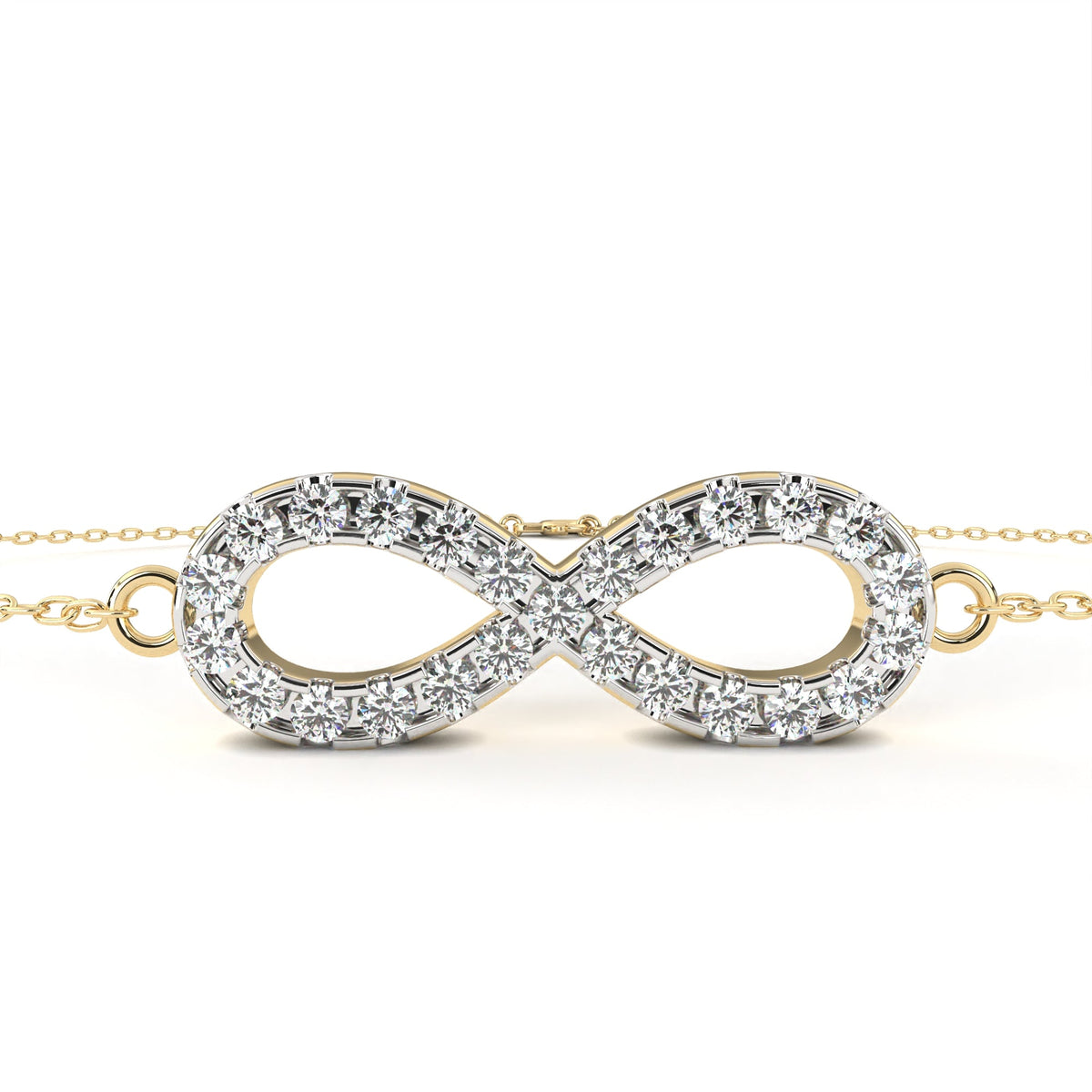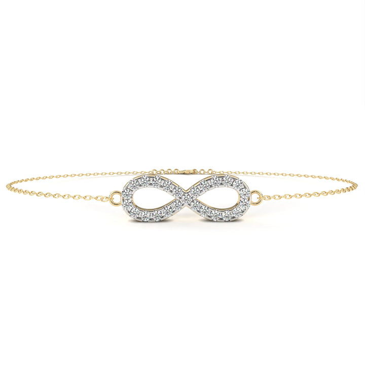 This charm bracelet is crafted from solid 10K white gold and features 0.39Ct round cut top-grade lab grown diamonds in an infinity shape prong setting dainty charm design set in solid 10K yellow gold. Customize any piece in 10K, 14K, or 18K yellow, rose, or white gold, with your choice of lab-grown or natural diamonds where applicable.