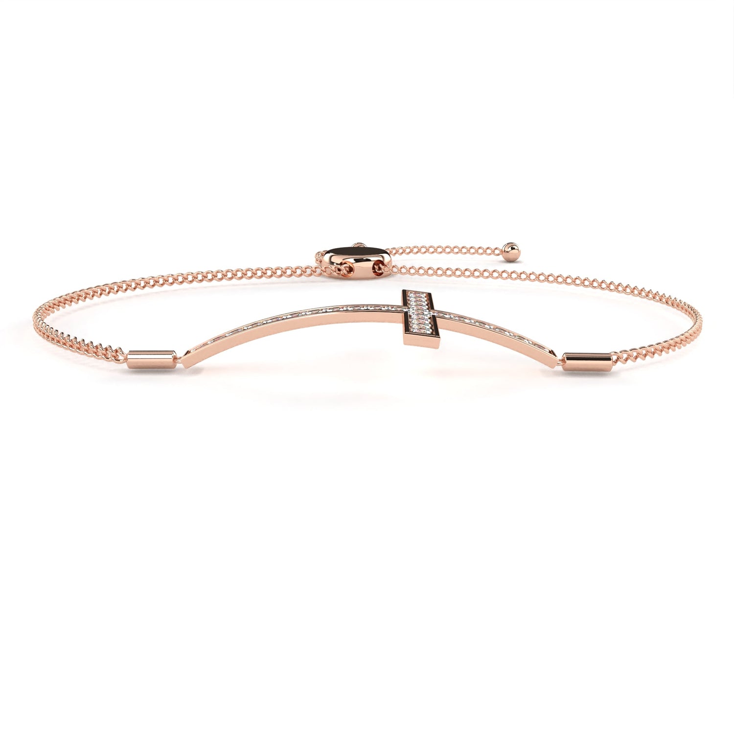 This charm bracelet is crafted from solid 10K white gold and features 0.33Ct round cut lab grown diamonds in a criss cross shape delicate prong setting antique-inspired design set in solid 18K rose gold. Customize any piece in 10K, 14K, or 18K yellow, rose, or white gold, with your choice of lab-grown or natural diamonds where applicable.
