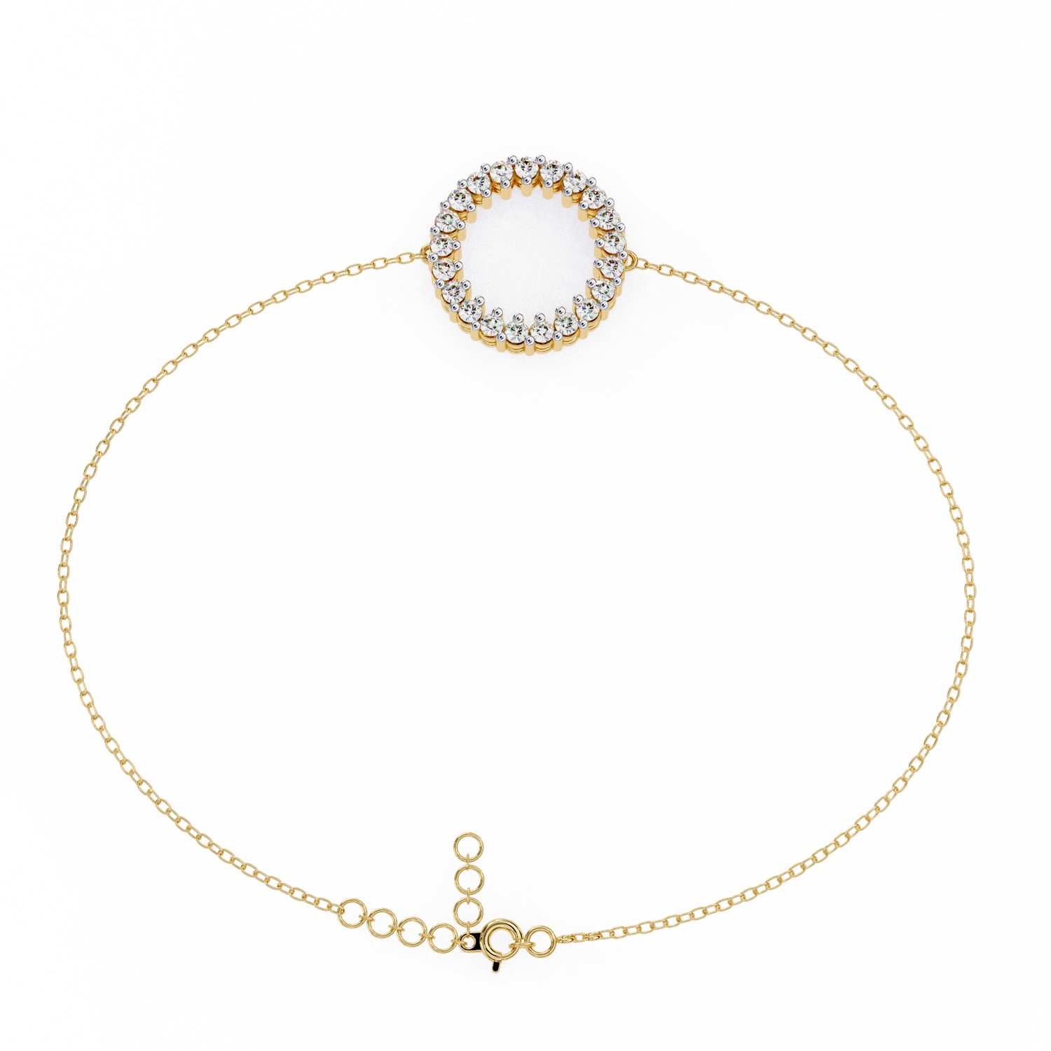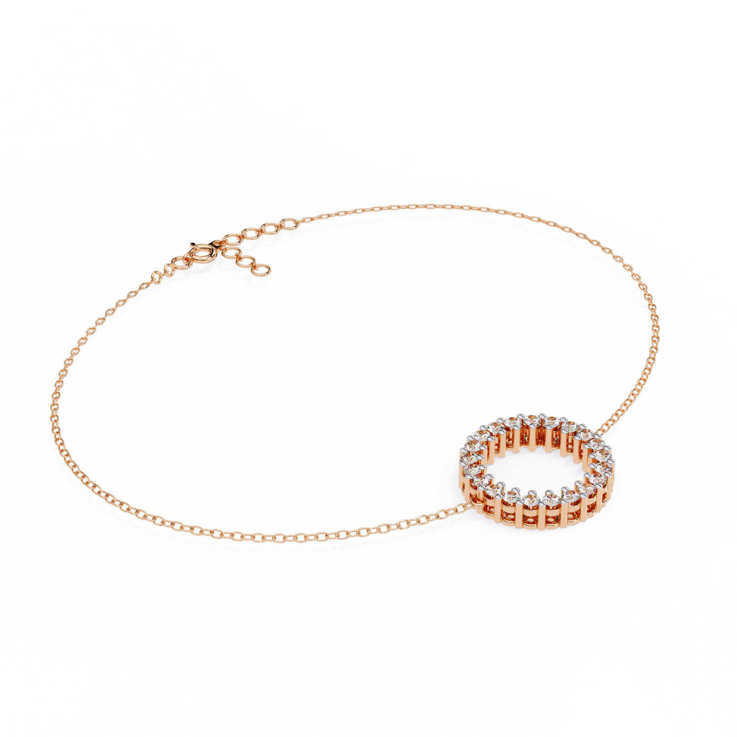 This charm bracelet is crafted from solid 10K white gold and features 0.15Ct round cut lab grown diamonds in a circle shape prong setting set in solid 14K rose gold. Customize any piece in 10K, 14K, or 18K yellow, rose, or white gold, with your choice of lab-grown or natural diamonds where applicable.