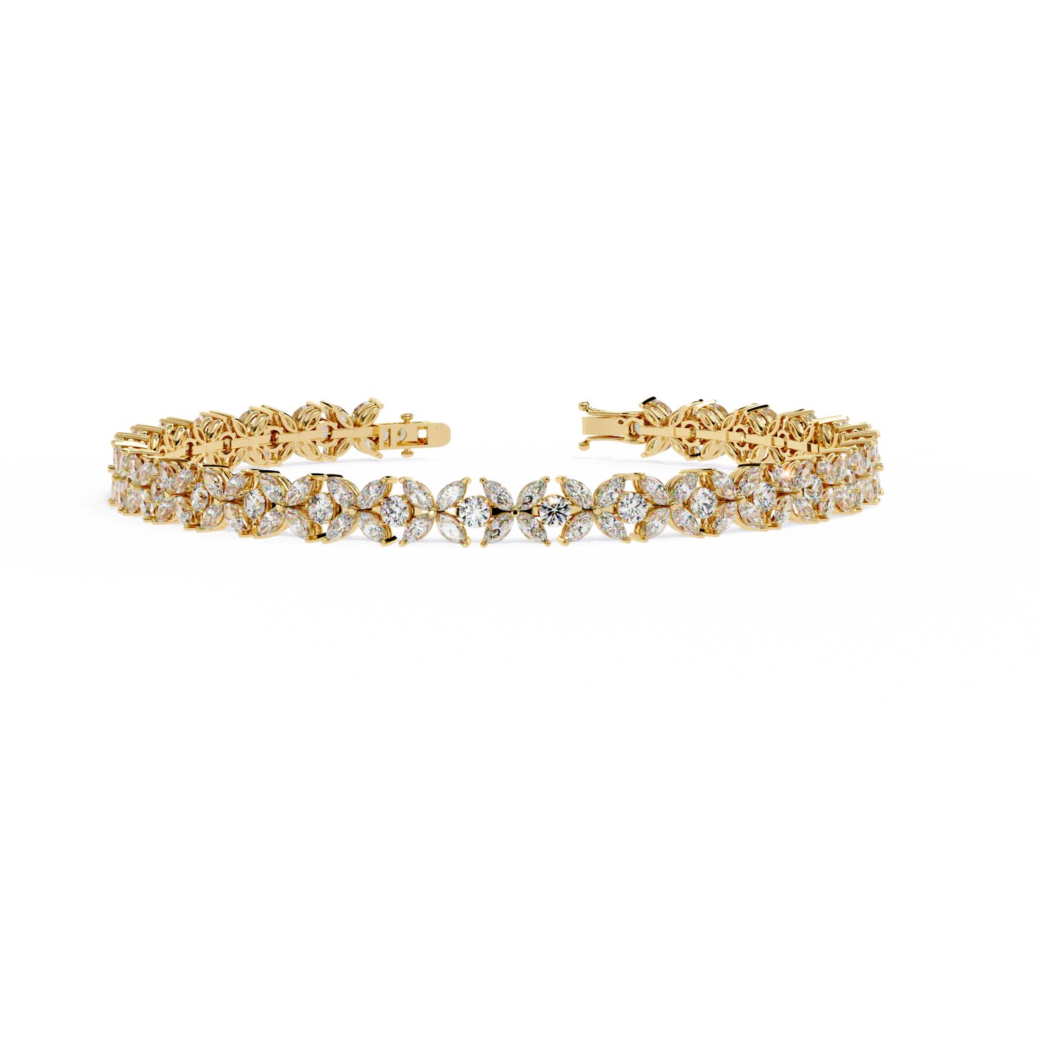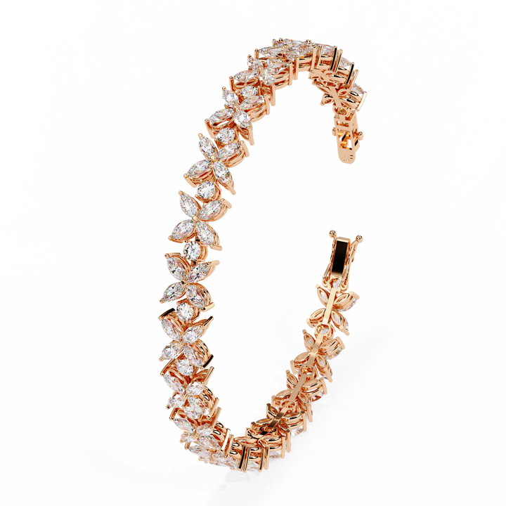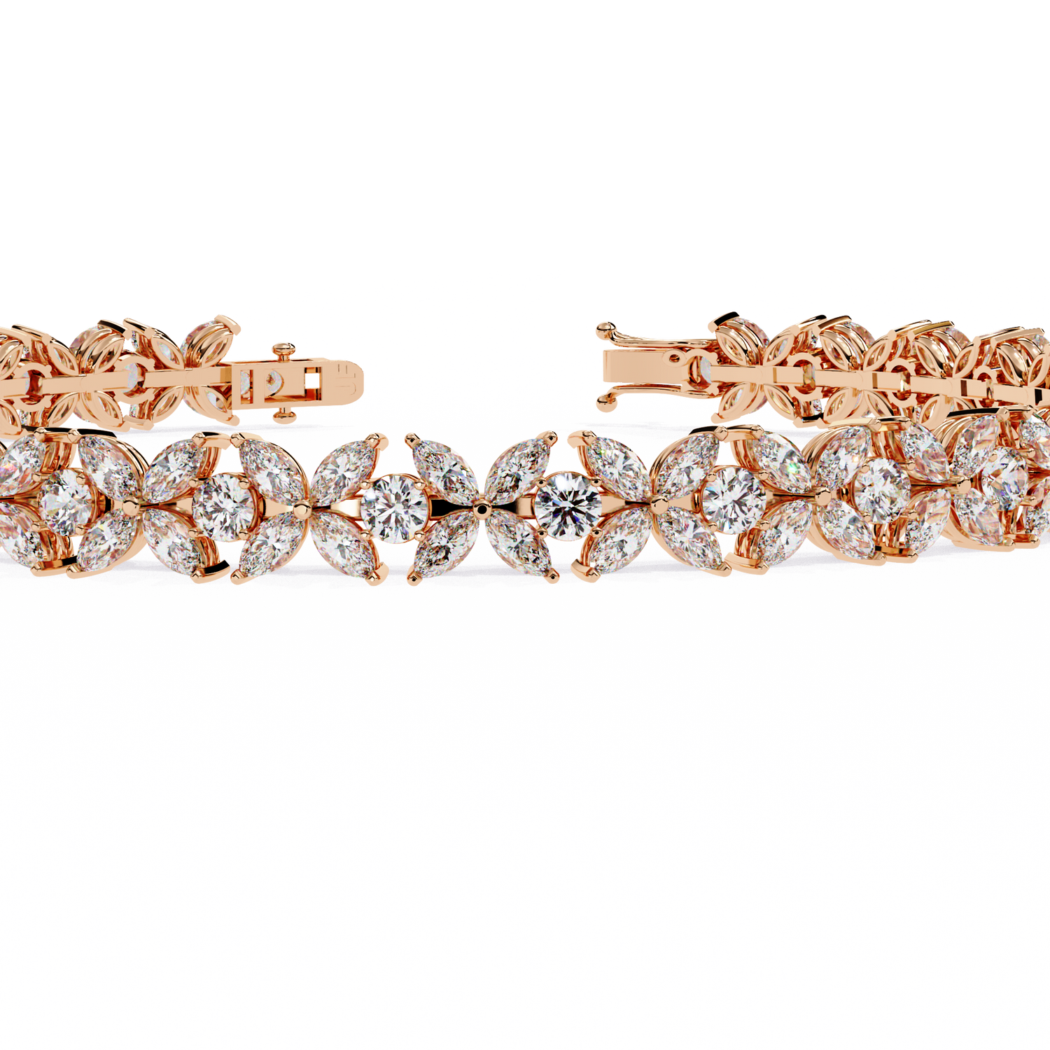 This tennis bracelet is crafted from solid 10K white gold and features 6.25Ct marquise and round cut lab grown diamonds in an antique vintage charm design set in solid 14K rose gold. Customize any piece in 10K, 14K, or 18K yellow, rose, or white gold, with your choice of lab-grown or natural diamonds where applicable.