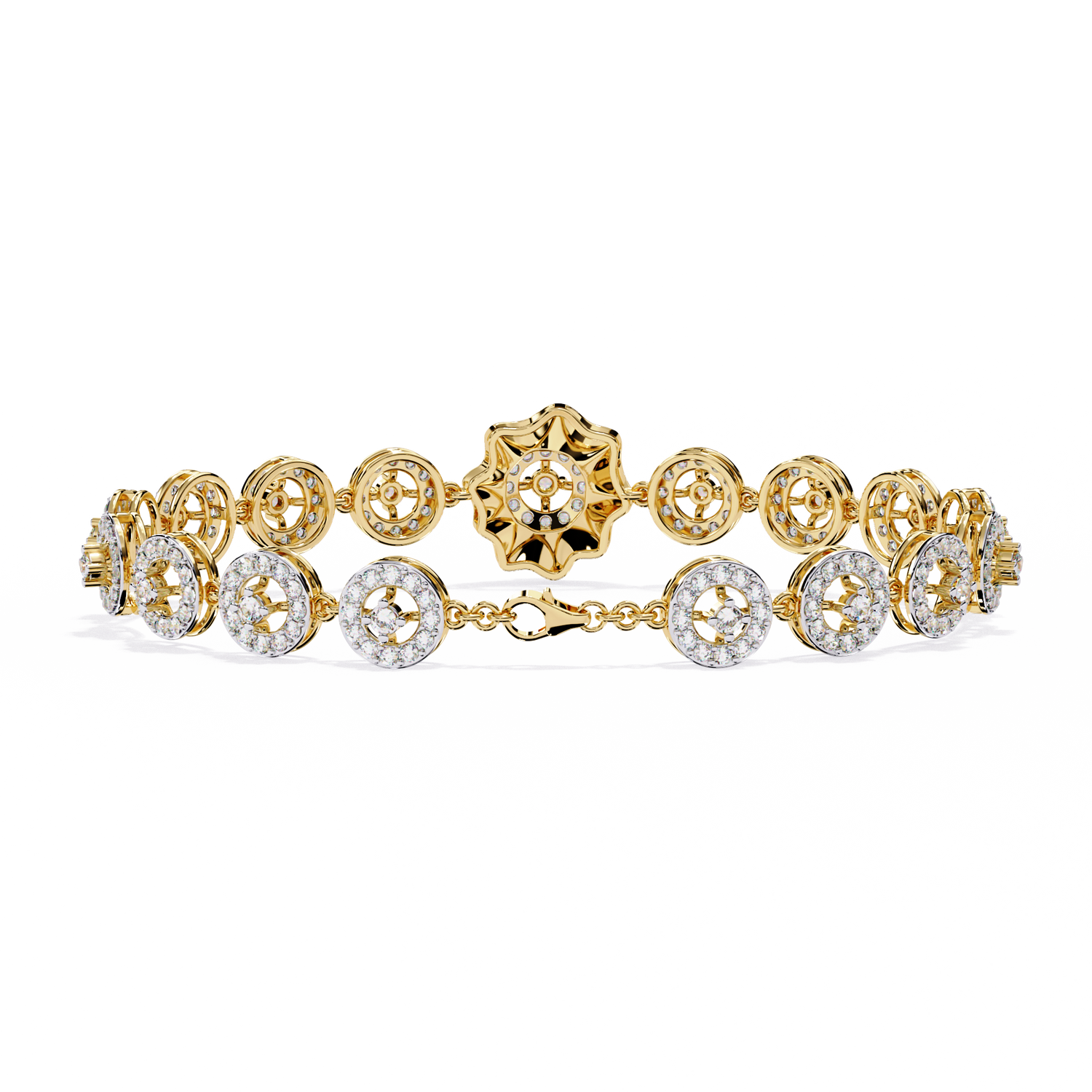 This tennis bracelet is crafted from solid 10K white gold and features a 2.16Ct round cut top grade lab grown diamond in a vintage classic line design set in solid 18K yellow gold. Customize any piece in 10K, 14K, or 18K yellow, rose, or white gold, with your choice of lab-grown or natural diamonds where applicable.