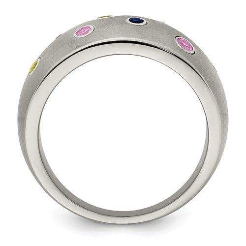 Handcrafted in brushed titanium with multi-color sapphires, 12mm width, domed design. Durable, scratch-resistant, lightweight, and hypoallergenic.