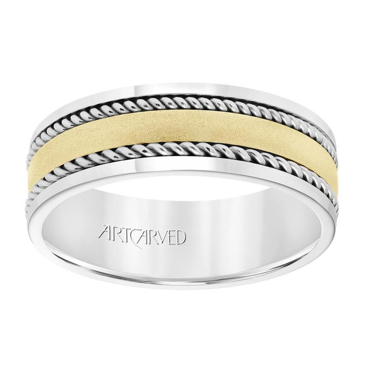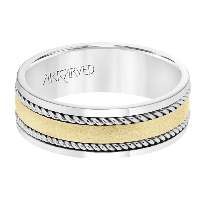 This 14k Two-Toned White Gold with Yellow Gold Center Wedding Band by Larson Jewelers is a contemporary symbol of commitment and style. The 7mm flat band features dual rope accents along the edges, a satin-finished yellow gold center, and polished white gold borders, creating dynamic contrast. Comfort-fit construction ensures wearability for daily use while blending modern design with timeless elegance. Ideal for men seeking a stylish, versatile, and luxurious wedding band, this piece exemplifies craftsmanship, sophistication, and enduring beauty, offering a bold yet classic statement for a lasting symbol of love.